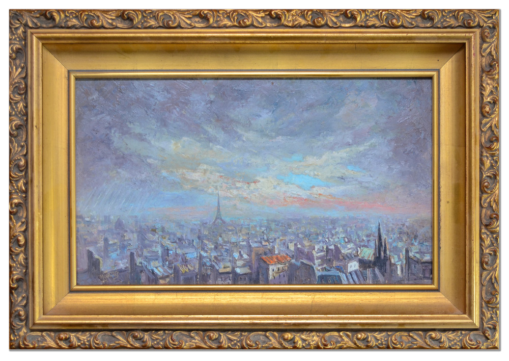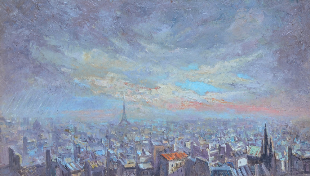 MOBERG, Pierre, (French, 20th Century): ''Montmartre 1962'' (View of Paris Rooftops with Eiffel Tower in the Distance), Oil/Canvas, sight size 9 1/2'' x 16'', signed lower left, framed, 14 1/2'' x 21 1/4''.