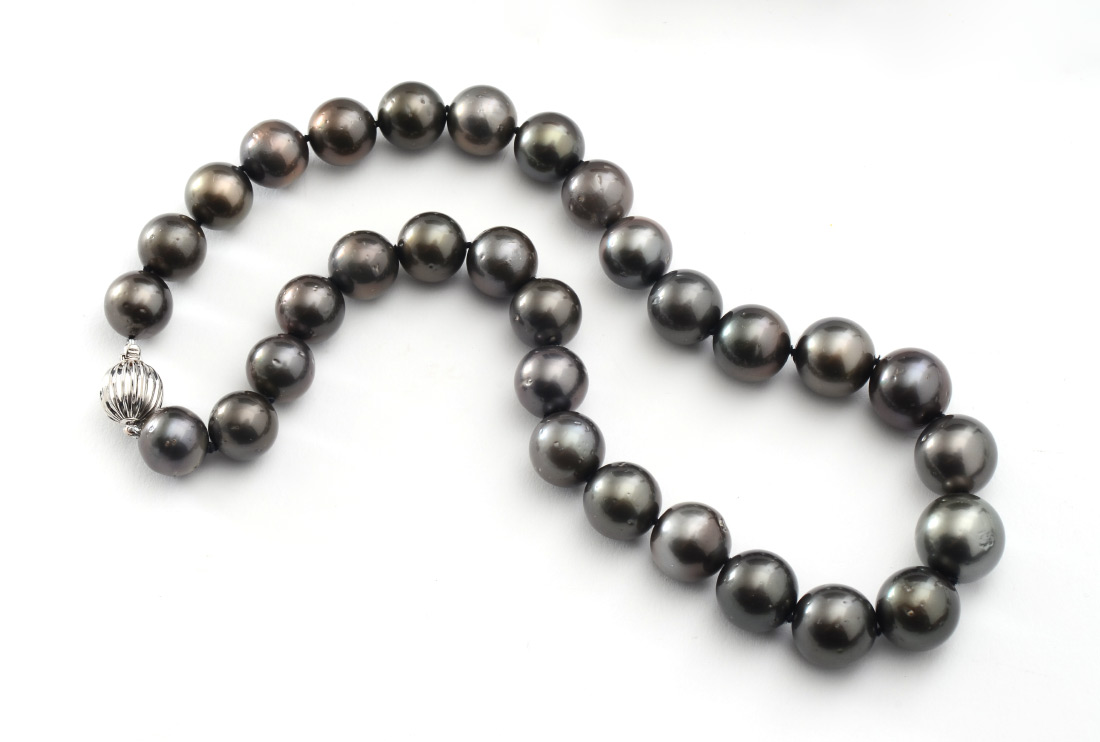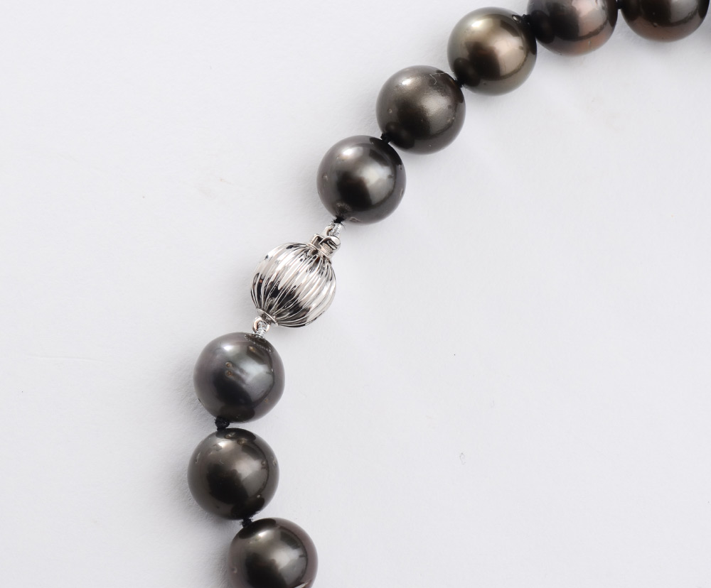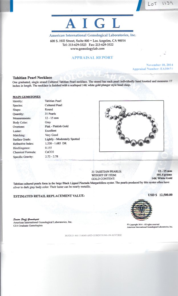 TAHITIAN CULTURED PEARL NECKLACE: Single strand cultured Tahitian pearls, 12-15 mm, gray in color with pinkish gold overtones, lightly-moderate spotting. 14K white gold ribbed melon clasp. Length 17''. Sold with AIGL GIA graduate's appraisal for $12,500.