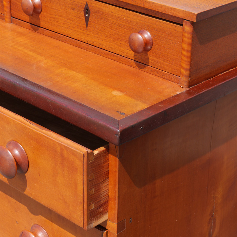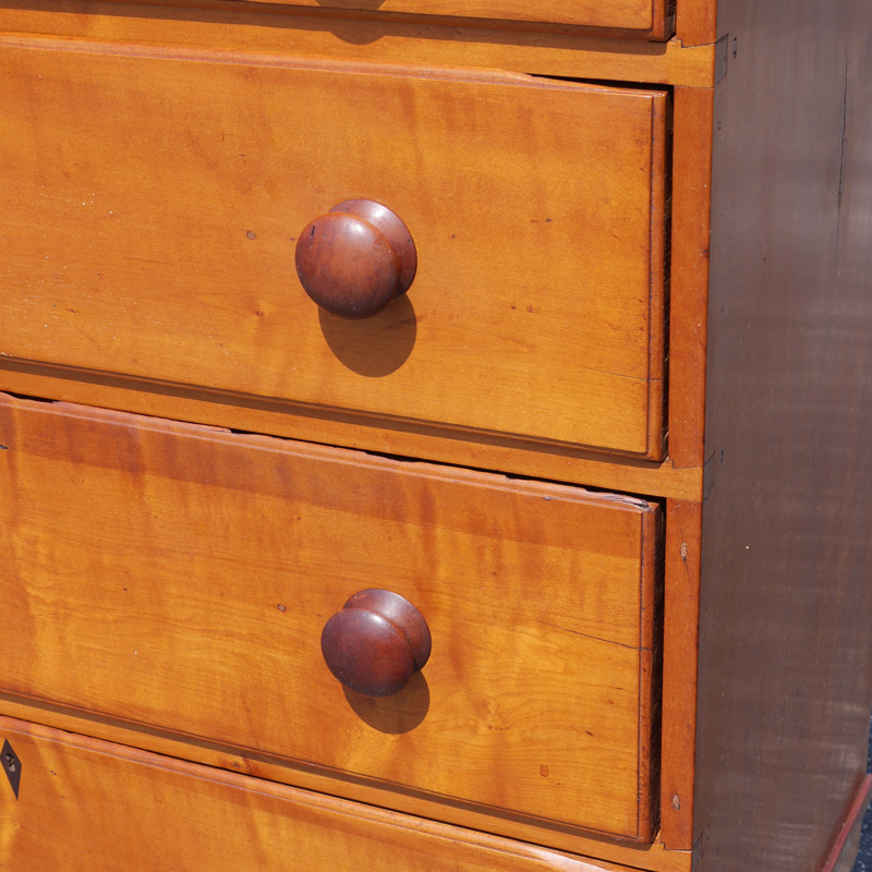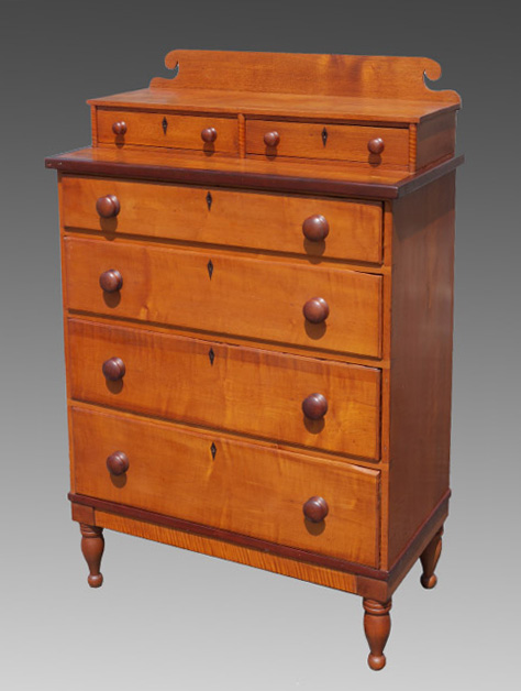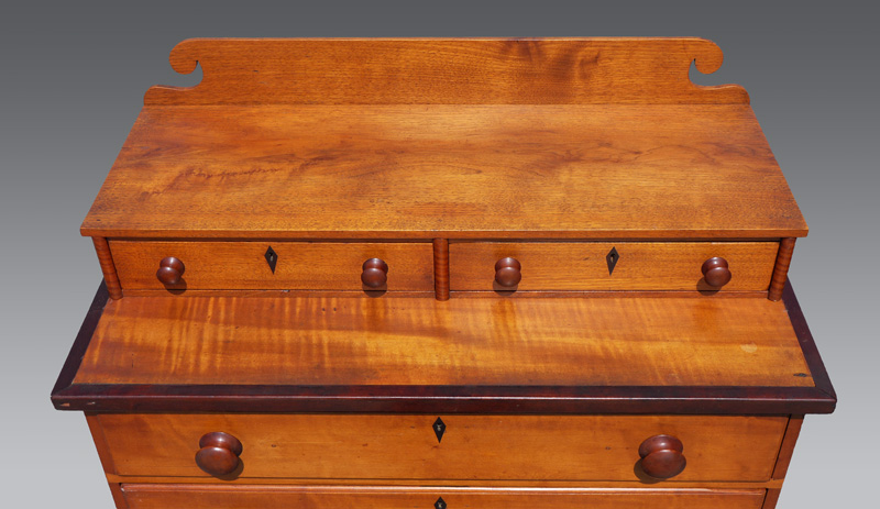 MIXED WOOD GENTLEMEN'S CHEST OF DRAWERS: Shaped gallery over 2 half drawer box over 4 full length drawers. Wood pulls, diamond inlay escutcheons, turned legs. Primarily tiger maple, with mahogany and other woods. Overall measures 54'' h. x 37 1/4'' x 20''.