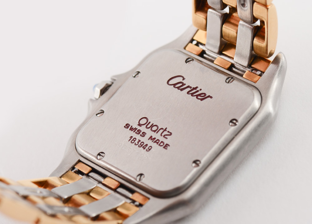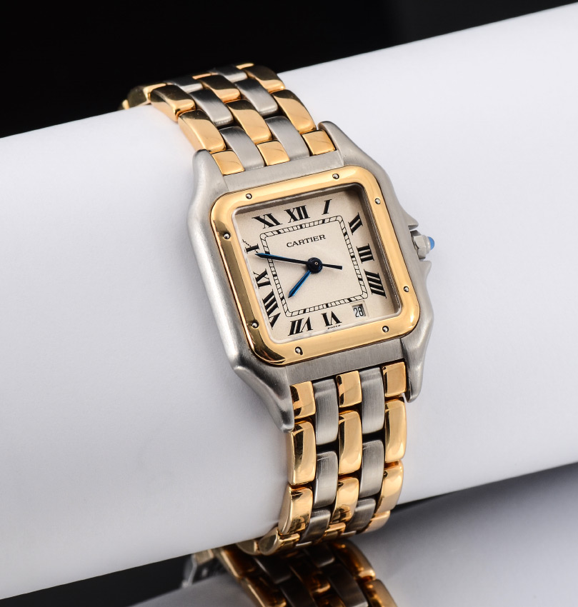 CARTIER TANK PANTHERE LADIES WATCH: 18K yellow gold and stainless steel bezel and bracelet. White dial, time and date function, quartz movement, sapphire crystal. In working order. Model number 183949.