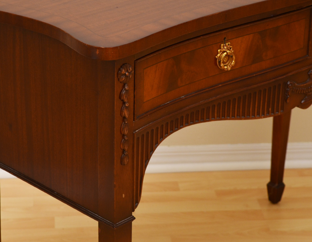 PETITE BANDED MAHOGANY SERVER: Banded top and drawer fronts, two drawers, applied bell flowers, spadefoot legs. Mid to late 20th C. Diminutive size makes it apartment friendly. Measures approx. 34 1/4'' tall x 45'' x 19''.