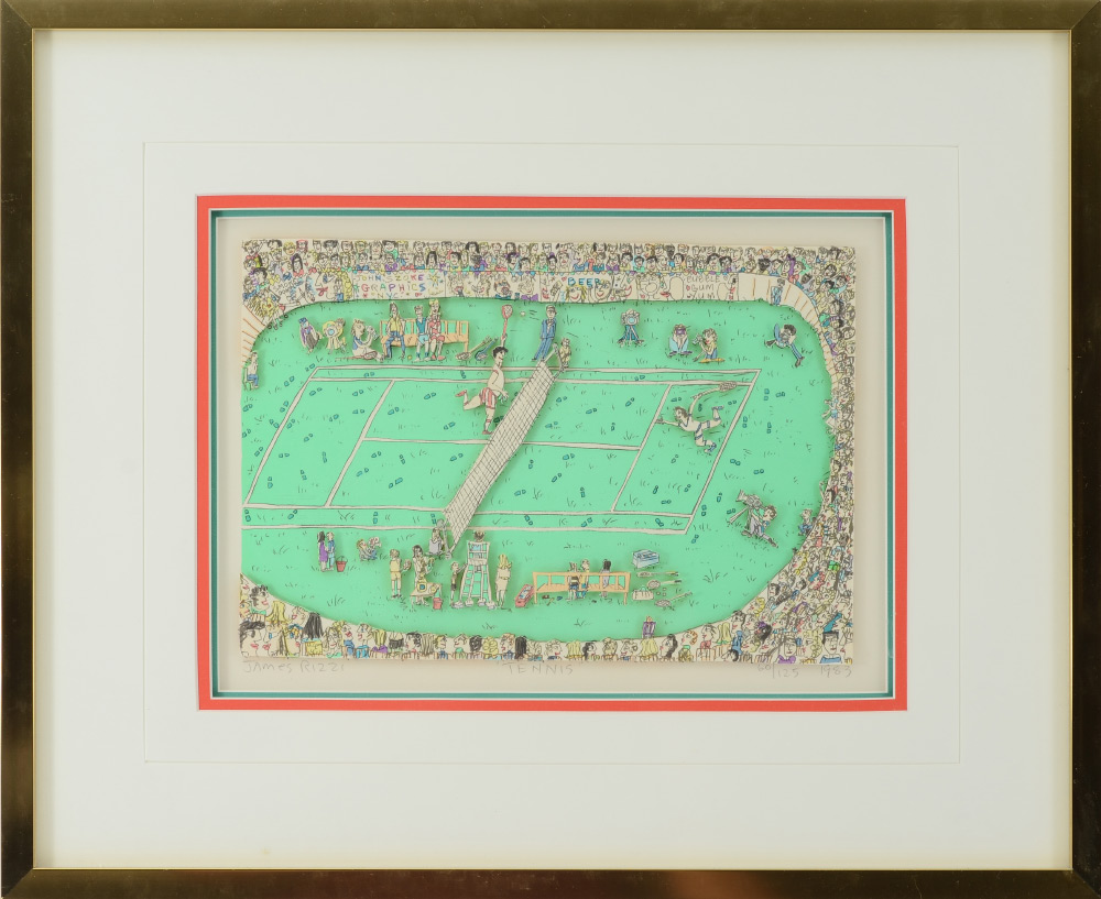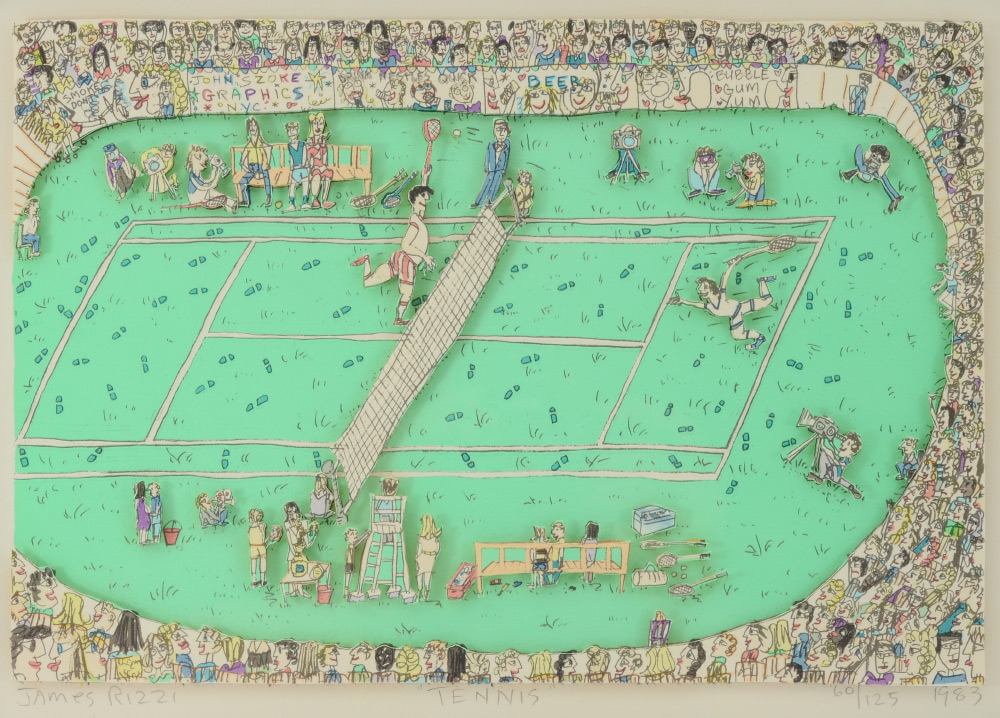 RIZZI, James, (American, 1950-2011): ''Tennis'', 3D Lithograph, sight size 9'' x 12 3/4'', pencil signed lower left, titled and numbered 60 of 125 lower right, dated 1983, Syd Entel framing and label verso, 17 1/2'' x 21''.