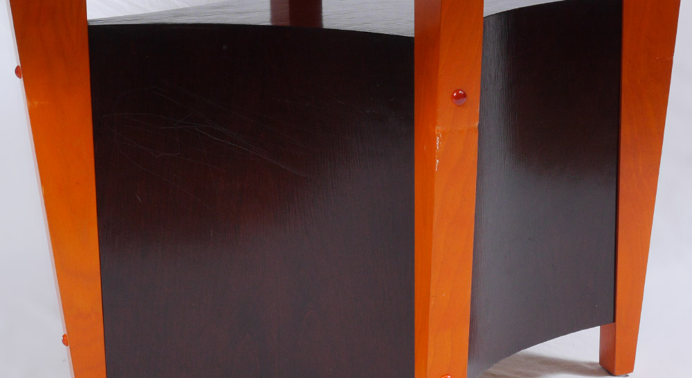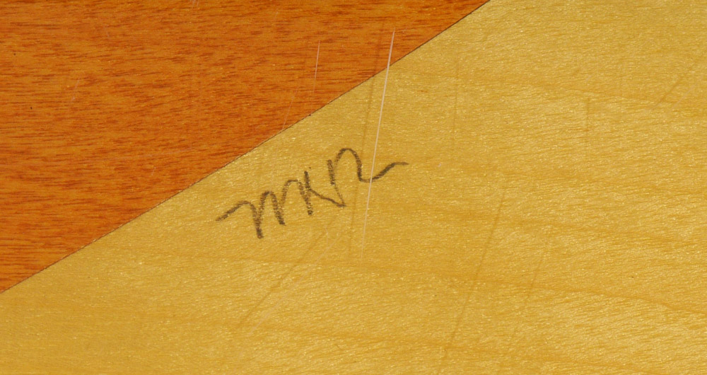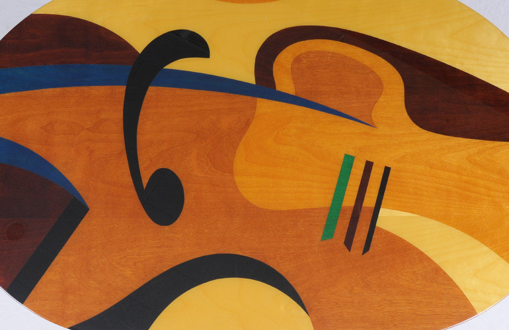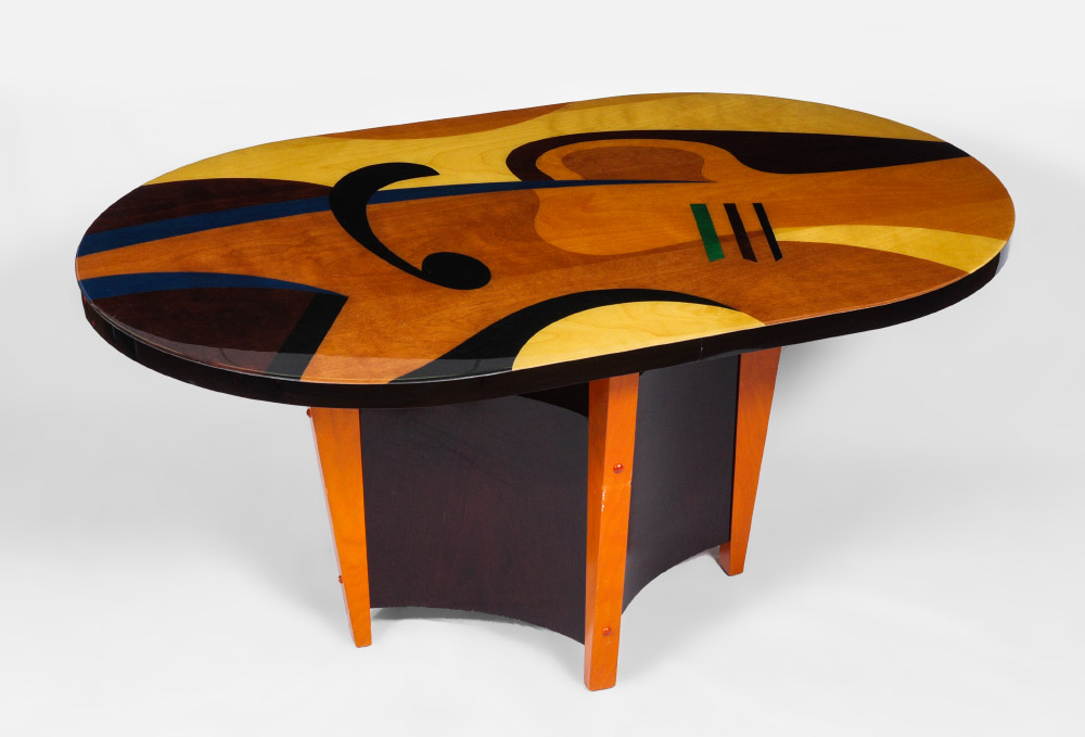 MODERN MARQUETRY INLAID DINING TABLE: Double D-end top with free form marquetry inlay with a variety of woods and colors, signed WIR?. Old sticker on base reads Custom Pablo, 60 x 38. Rhombus base with 4 legs, overall measures 29 1/4'' h. x 60'' x 30''.