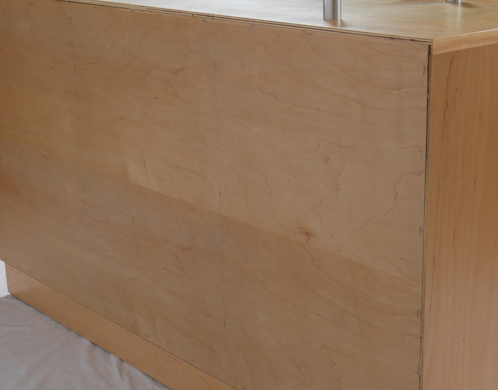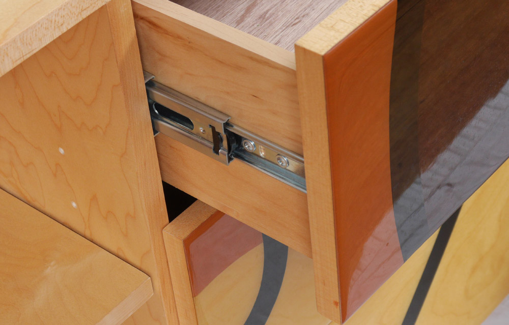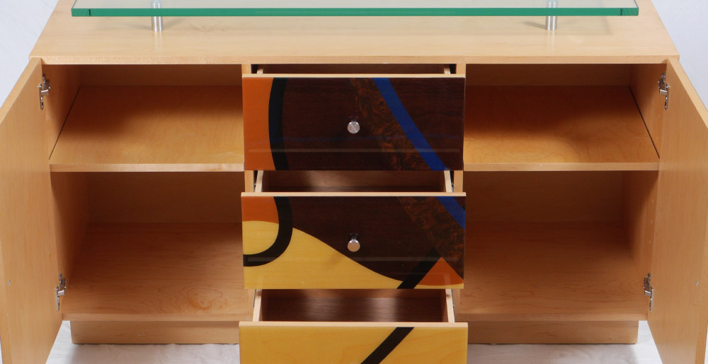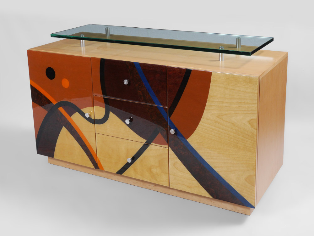 MODERN MARQUETRY INLAID SIDEBOARD: Open glass shelf over base, marquetry inlay front with a variety of woods and colors. 3 central drawers, 2 side doors with single shelf. Overall measures 31 3/8'' h. x 54'' x 20''.