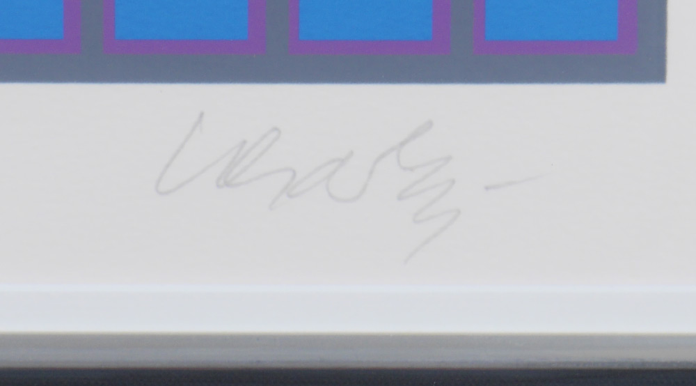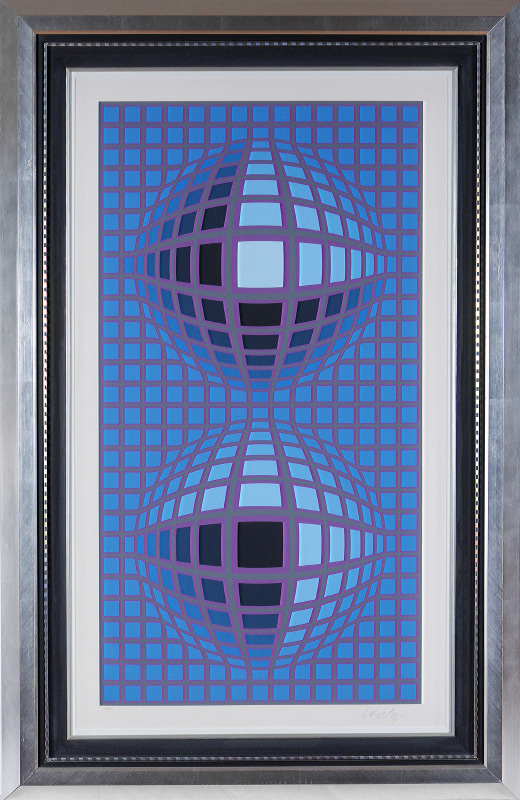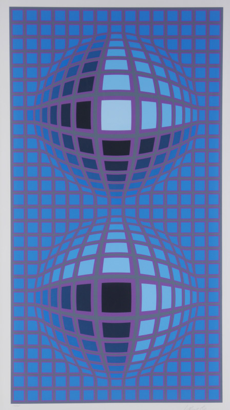VASARELY, Victor, (French/Hungarian, 1906-1997): Op Art Composition with Two Spheres in Blue, Serigraph, sight size 37'' x 21 1/2'', pencil signed lower right, numbered lower left 173 of 325, custom mat and frame, 46'' x 30''.