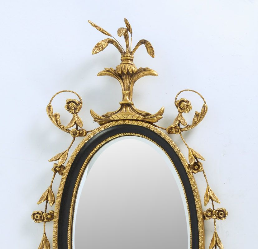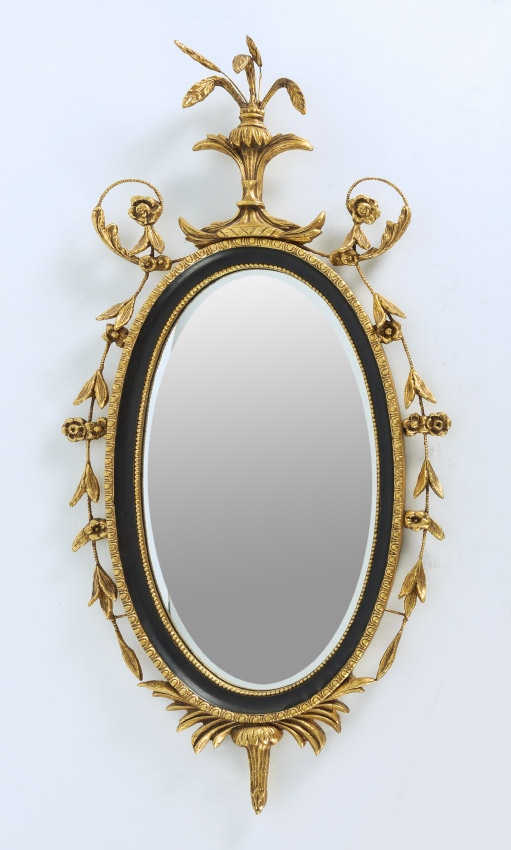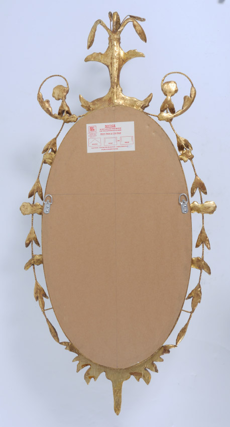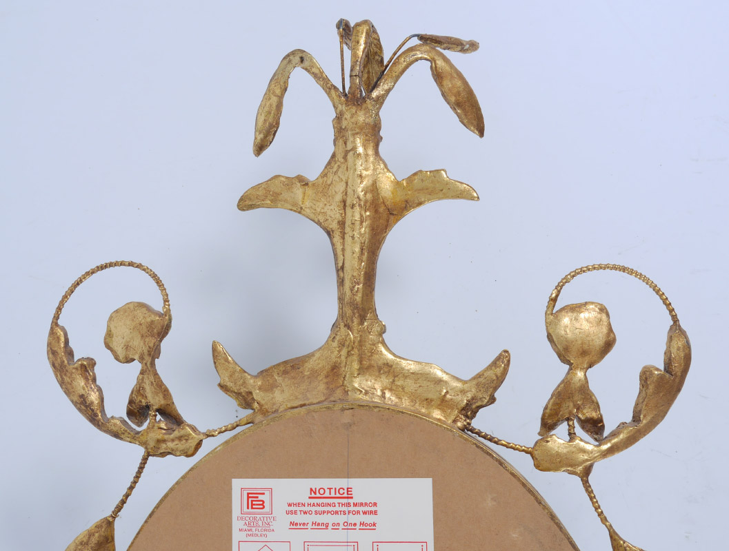 CONTINENTAL OVAL GOLD GILT MIRROR: Gesso and carved gilt wood mirror, urn crest, sides with floral and foliate garland, beveled glass recently replaced with newer backing. Overall measures 43 1/2'' h. x 20'' x 1 1/2''.