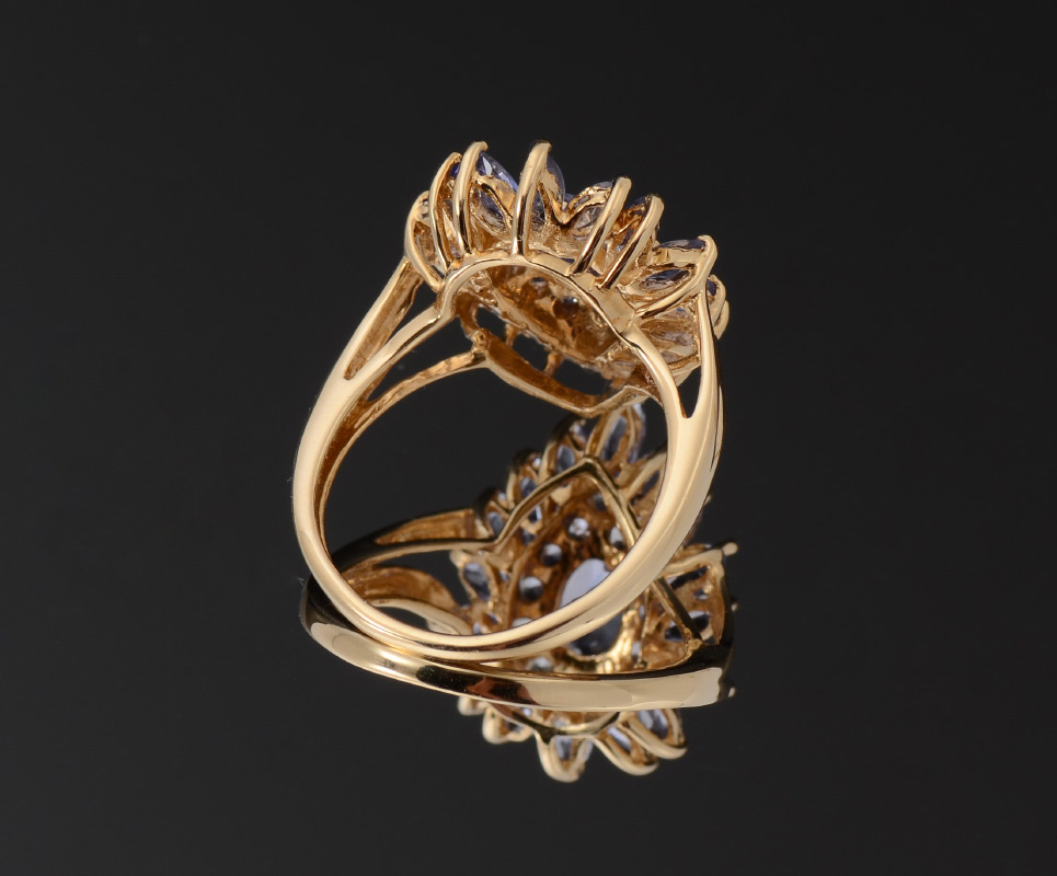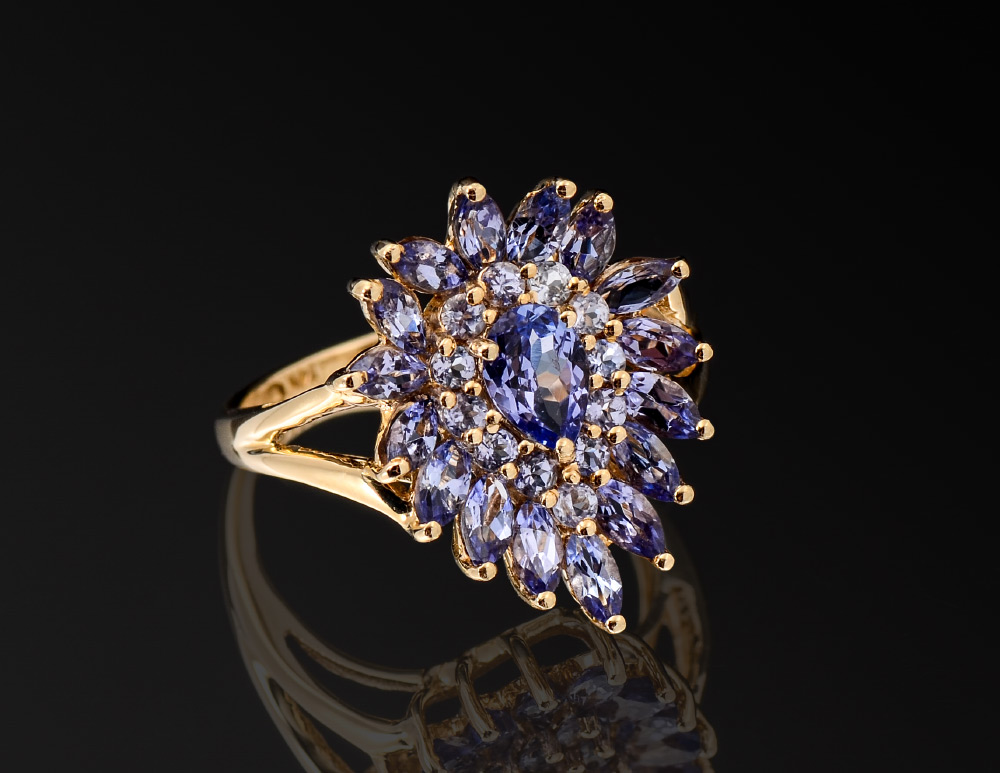 TANZANITE DINNER RING: 14K yellow gold ring contains mixed cut tanzanite totaling approx. 2.50 Ct. The tanzanite is prong set. Weight: 3.5 grams. Size: 6