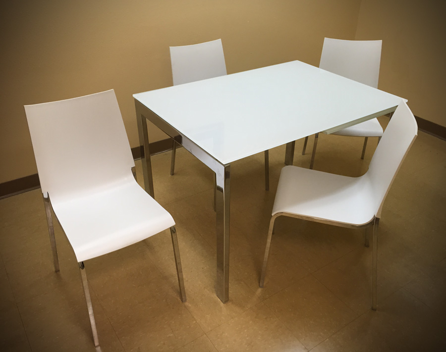 BONTEMPI CASA GLASS TOP EXPANDABLE TABLE WITH 4 CHAIRS: Crome frame table with frosted white glass top, measures 29 3/4'' h. x 43 1/2'' x 31 1/2'', expands to 63 1/4'' overall. Sold with 4 Bontempi Casa Eva white hard vinyl chairs with chrome legs, 33 3/4'' h. x 15 1/4'' x 21''.
