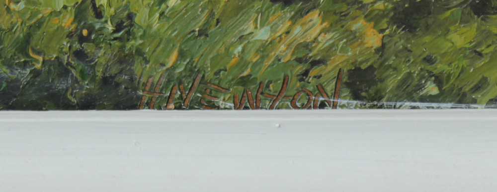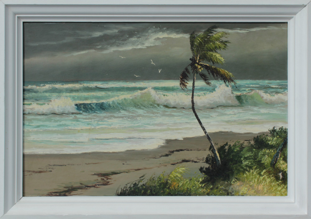 NEWTON, Harold, (American, 1934-1994): Rio Del Mar Beach Scene, Oil/Upson, sight size 24'' x 36'', signed lower right, original painted white frame, 28 3/4'' x 41''.