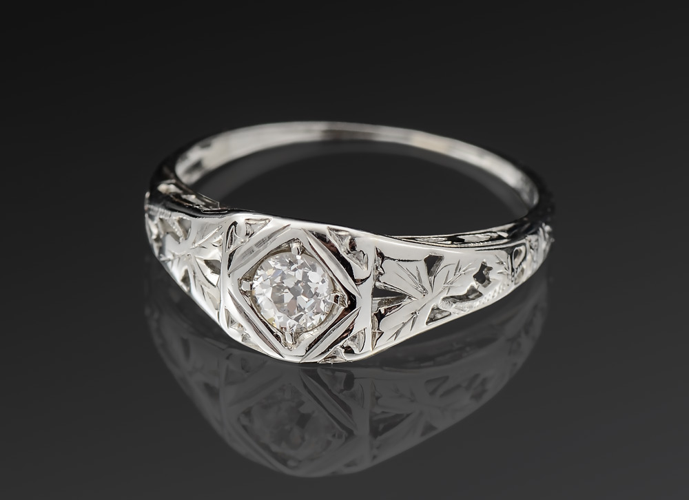 EARLY 20TH C ART DECO DIAMOND SOLITAIRE RING: 18K pierced white gold ring centers an approx. .28 Old European cut diamond of VS clarity and near colorless color. Size 6.
