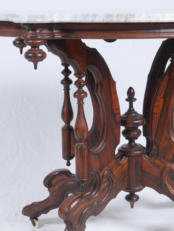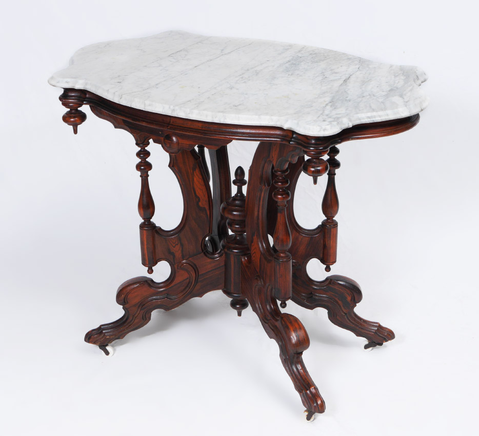 VICTORIAN ROSEWOOD MARBLE TOP TABLE: White variegated marble top, carved and shaped rosewood base in typical Victorian stylings, on castors. Overall measures 29 1/2'' h. x 36 1/2'' x 23''.