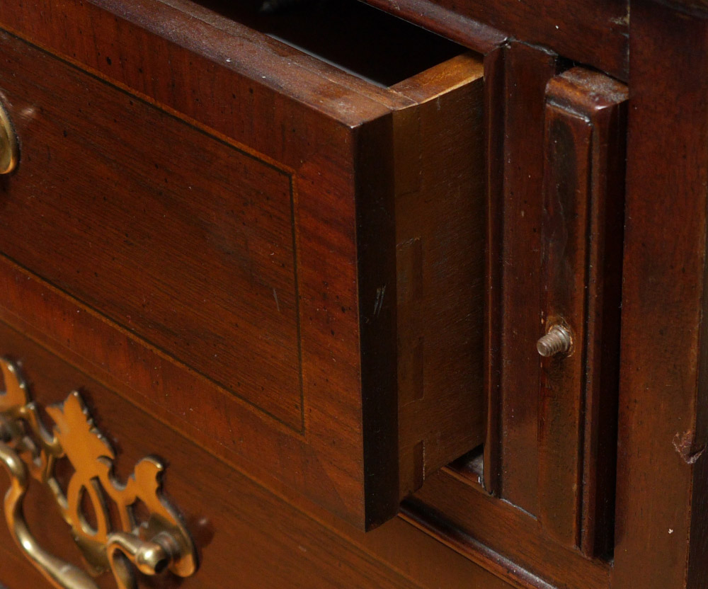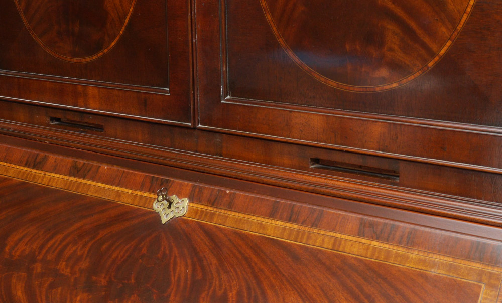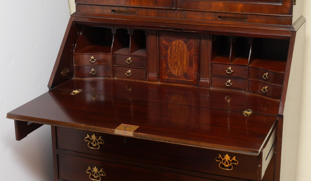 DREXEL HERITAGE SECRETARY BOOKCASE: Upper part bookcase with architectural pediment, leaf finial, richly grained blind doors with 2 wood shelves over 2 slide out candle shelves. Slant front secretary desk over 4 drawers on 4 feet. Overall measures 89'' h. x 40'' x 21 1/2''.