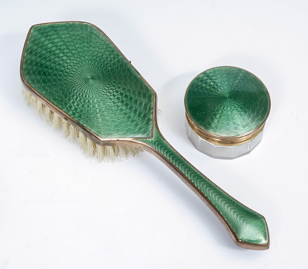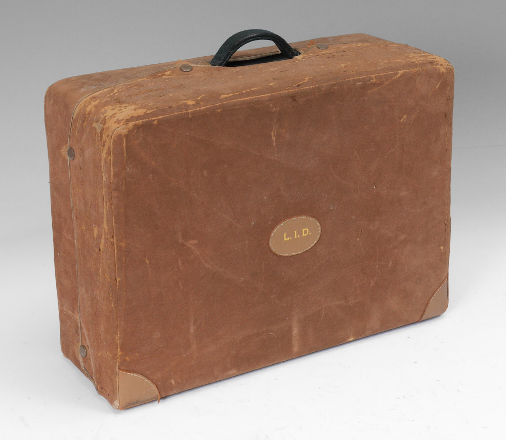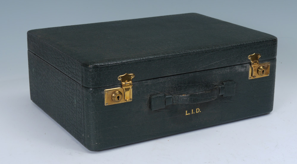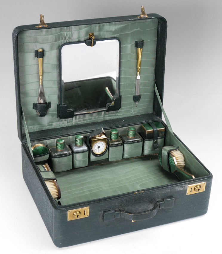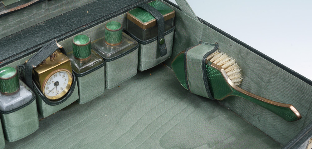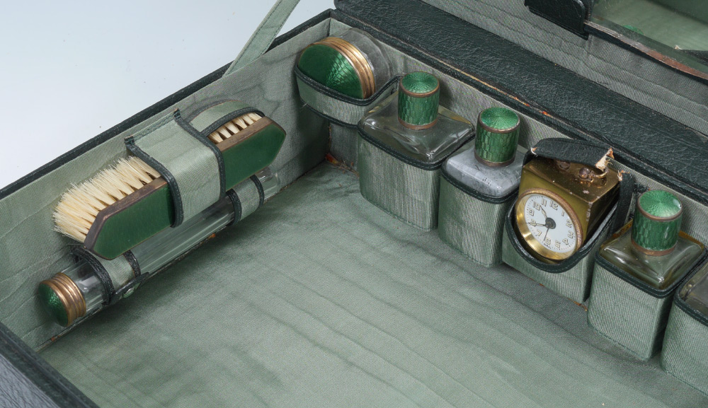 GERMAN GUILLLOCHE TOILETRY TRAVEL CASE: Early 20th century men's travel valet leather suitcase with fitted interior holding an assortment of bottles and brushes with green guilloche handles and lids. Also included is a small travel alarm clock (not functioning), mirror, shoehorn and nail file. Case retains its brown soft leather cover, monogrammed L.I.D.. Overall measures 6 3/4'' x 17'' x 14''.