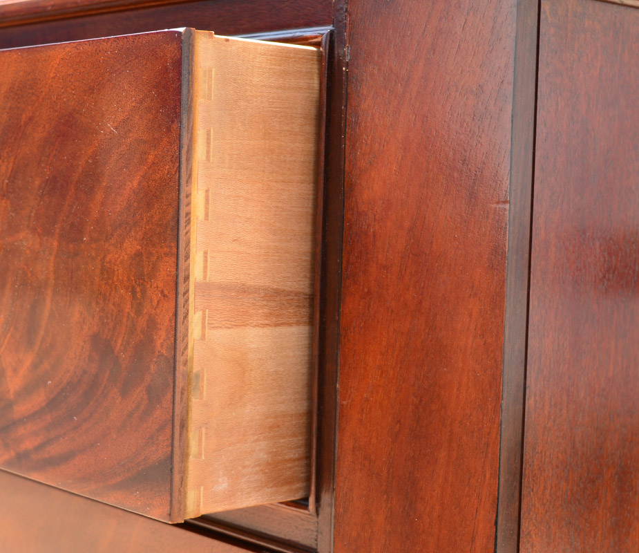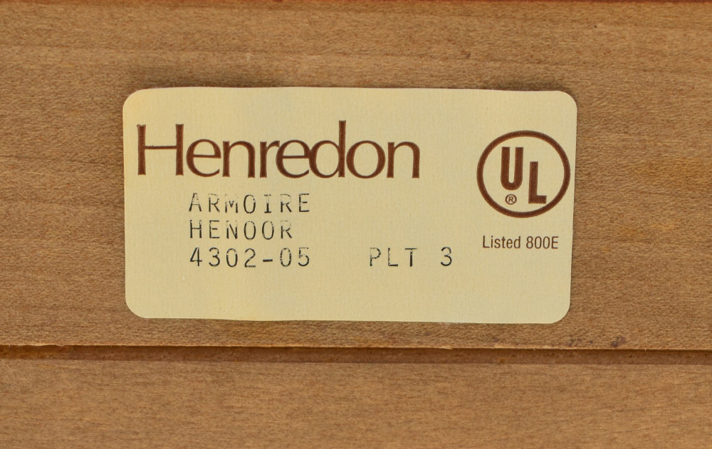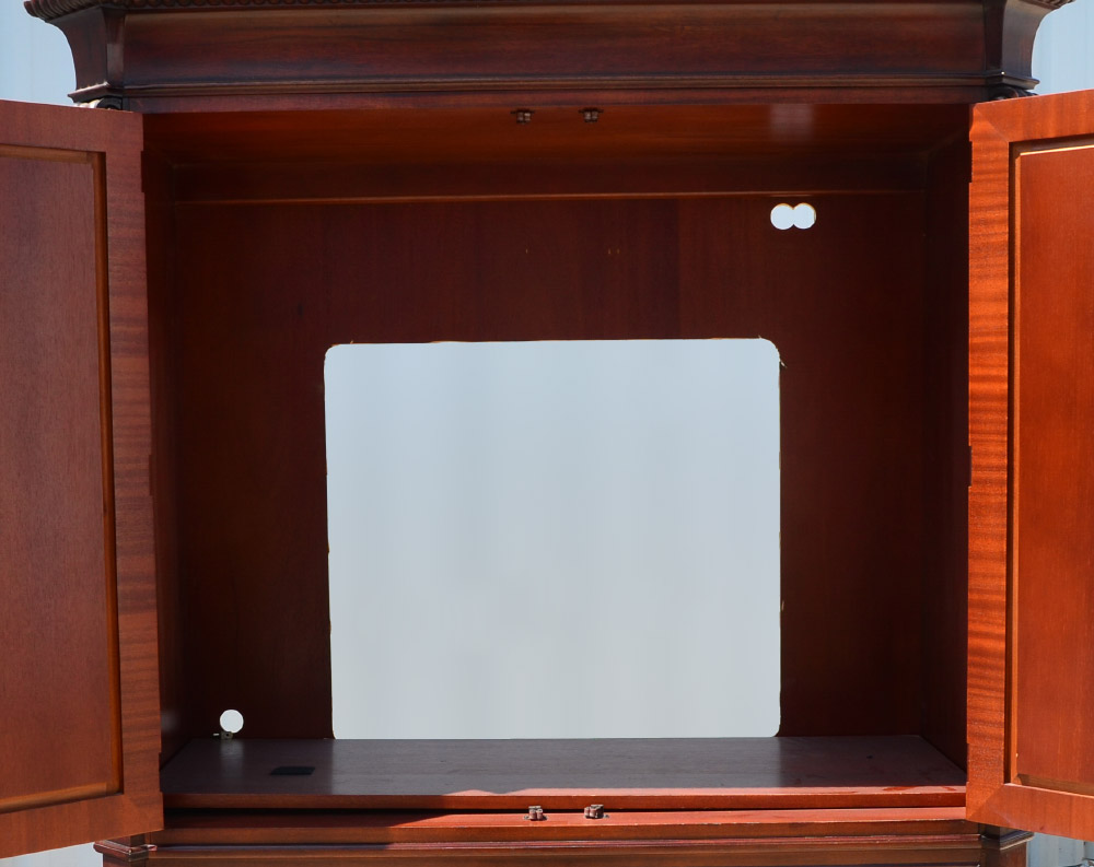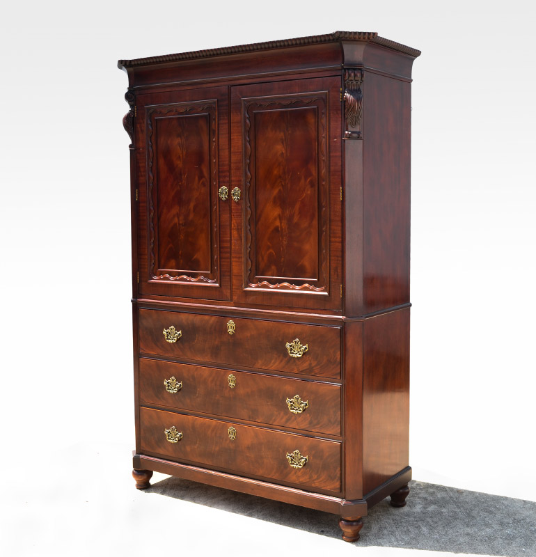 HENREDON MAHOGANY CABINET: Richly grained mahogany media center cabinet, 2 doors with single shelf, open back for ventilation and access over 3 full length drawers. Canted stiles with carved decoration. Overall measures 80 1/4'' h. x 54'' x 24''.