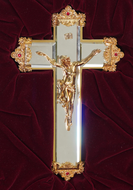 VITRINE DISPLAY TABLE WITH CROSS: 2 pieces total to include 1) Side table with glass inset hinged top, gilt metal accent trim, shaped sides, ormolu decoration at joints, shaped legs with ormolu at feet. 27 3/4'' h. x 24 1/4'' x 14 1/2''. 2) Mirrored cross depicting the crucifixion, gilt metal Jesus and accents in original display box. Cross 10'' x 6 3/4'', box 13 1/4 x 10'' x 3 1/4''.
