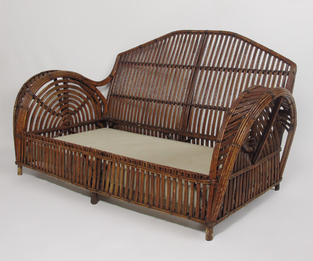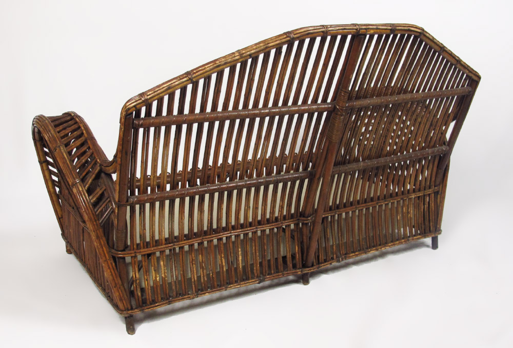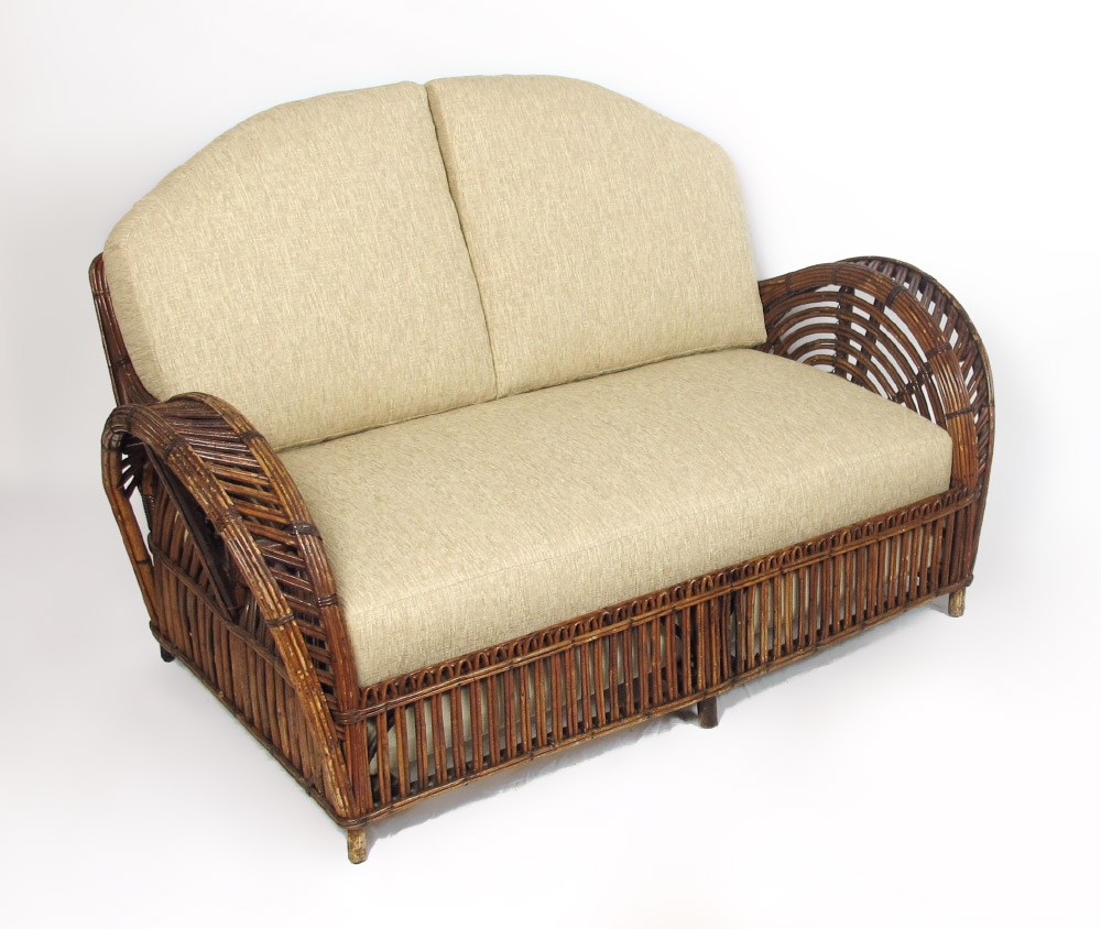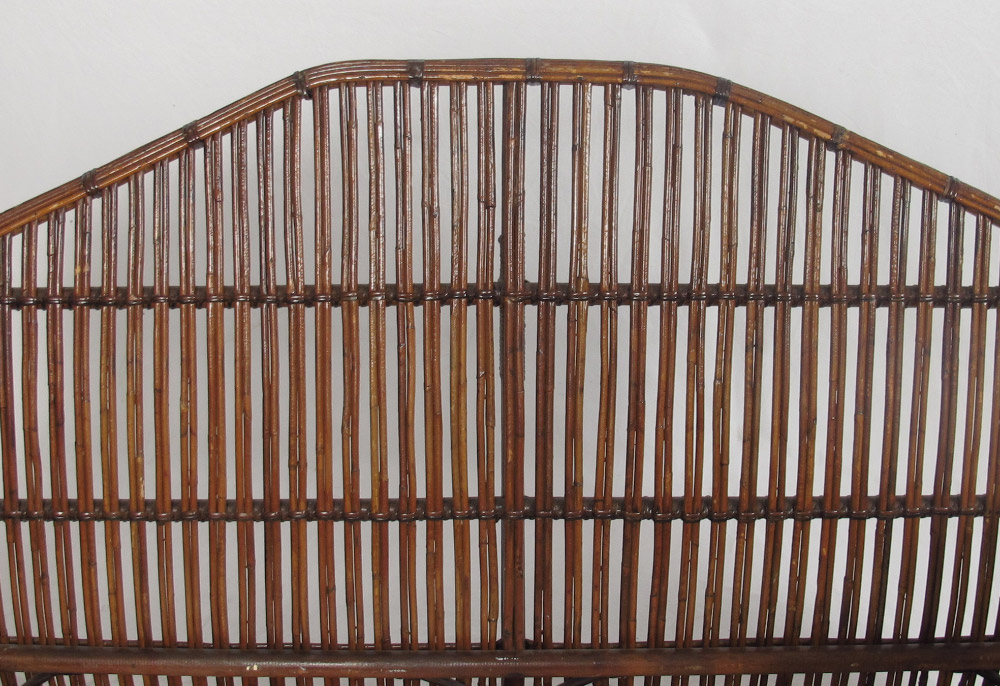 FRANCO ALBINI RATTAN SOFA: Peacock design with newly upholstered back and seat cushion. Aged varnish patina. Loveseat 37'' h. x 60'' x 39''.