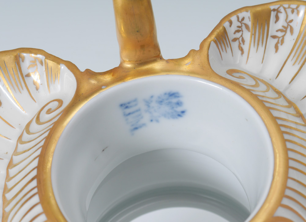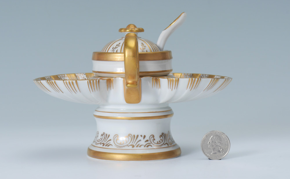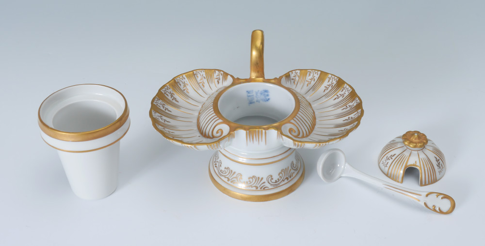 GERMAN PORCELAIN CAVIAR DISH: Elaborate gold gilding, removable center with lid and spoon. RPM (Royal Porcelain Manufacture) mark inside. Measures approx. 4'' high x 6.5'' x 5''.