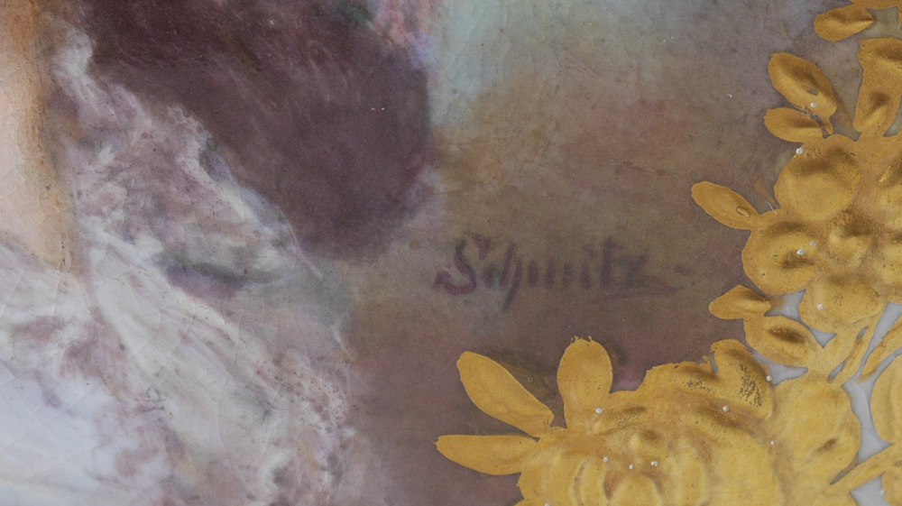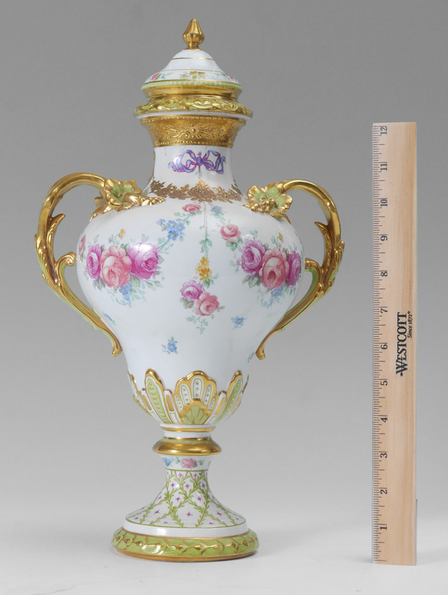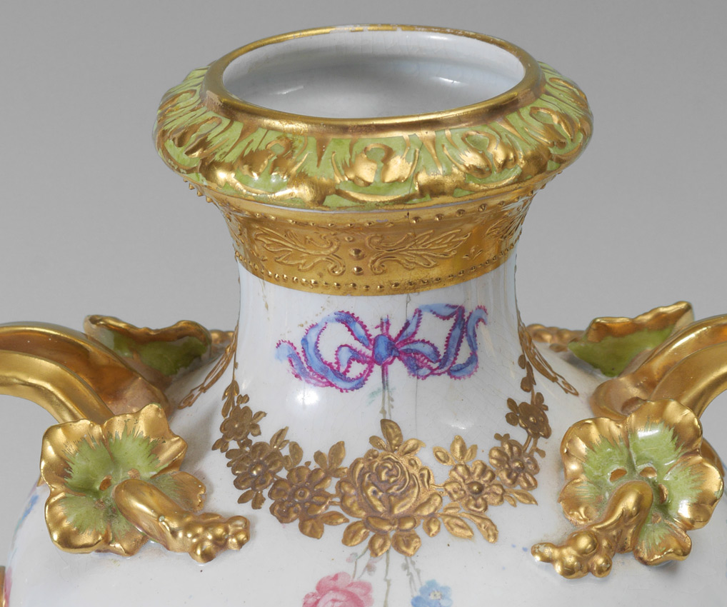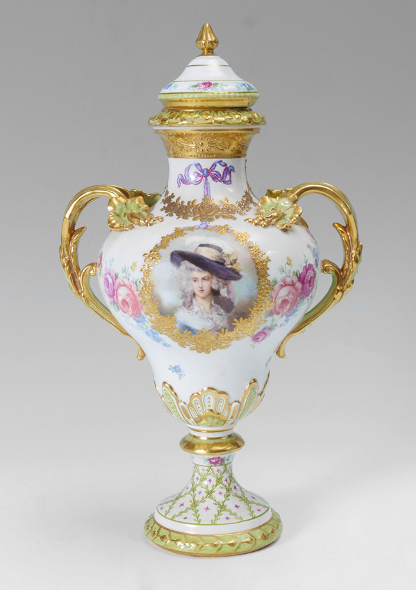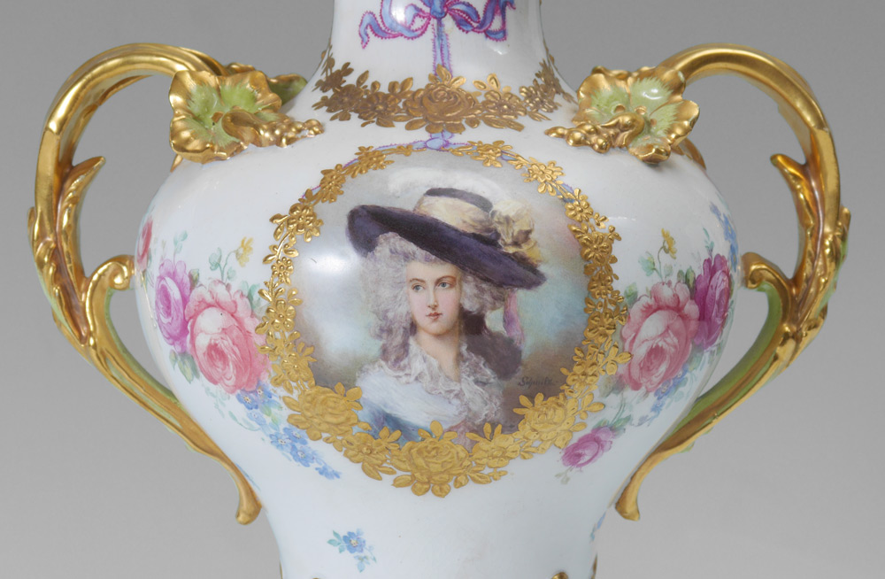 ROYAL BONN HAND PAINTED PORTRAIT URN: Double gilt handles, central medallion with hand painted portrait of a woman signed Schnitz. Transfer floral and applied gilt decoration. Impressed Franz A. Mehlem mark and others under base. Overall 15 1/4'' h. x 8 3/4'' x 6 1/2''.