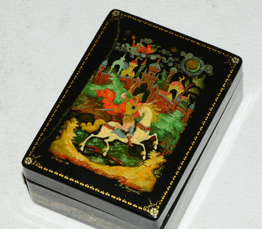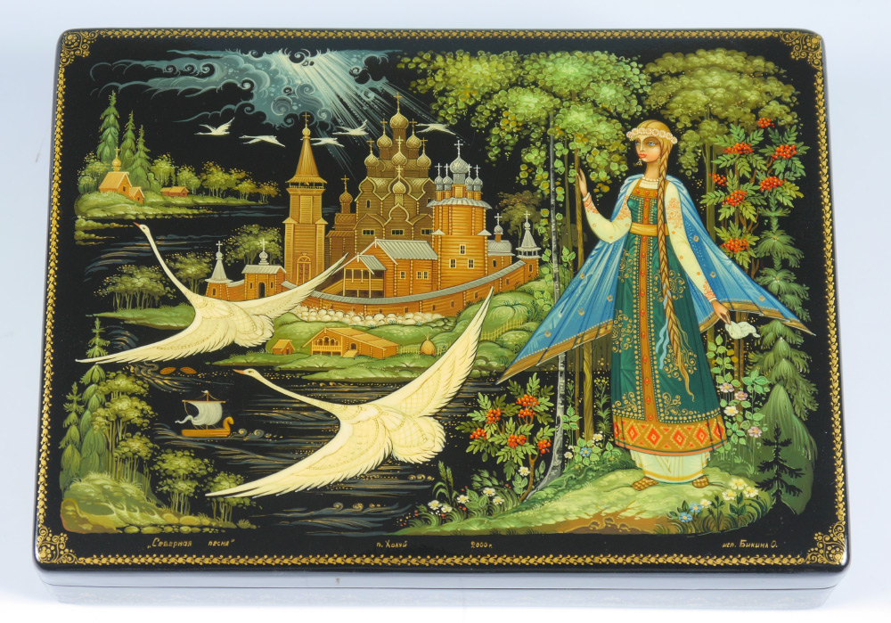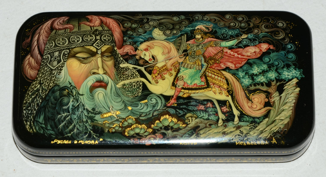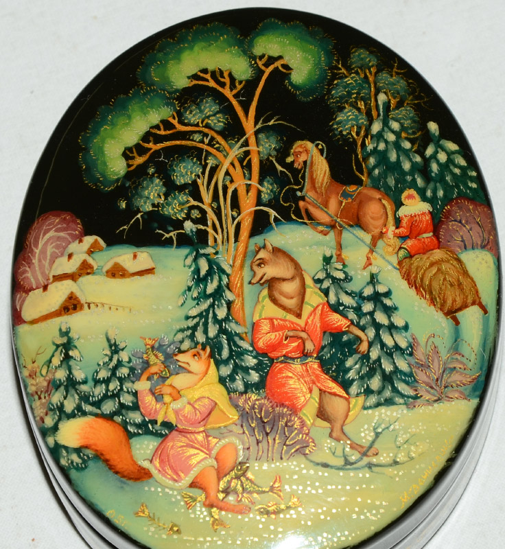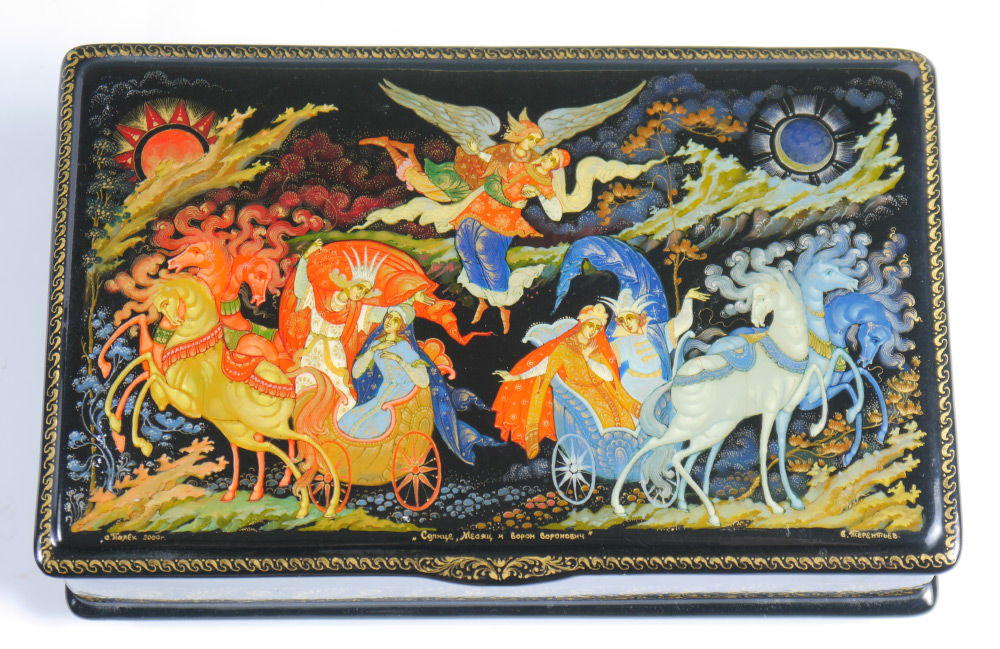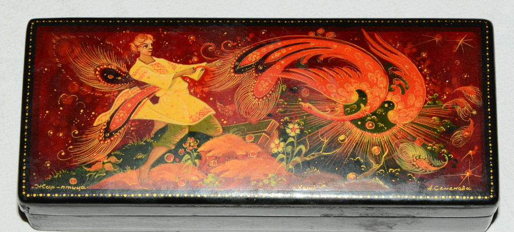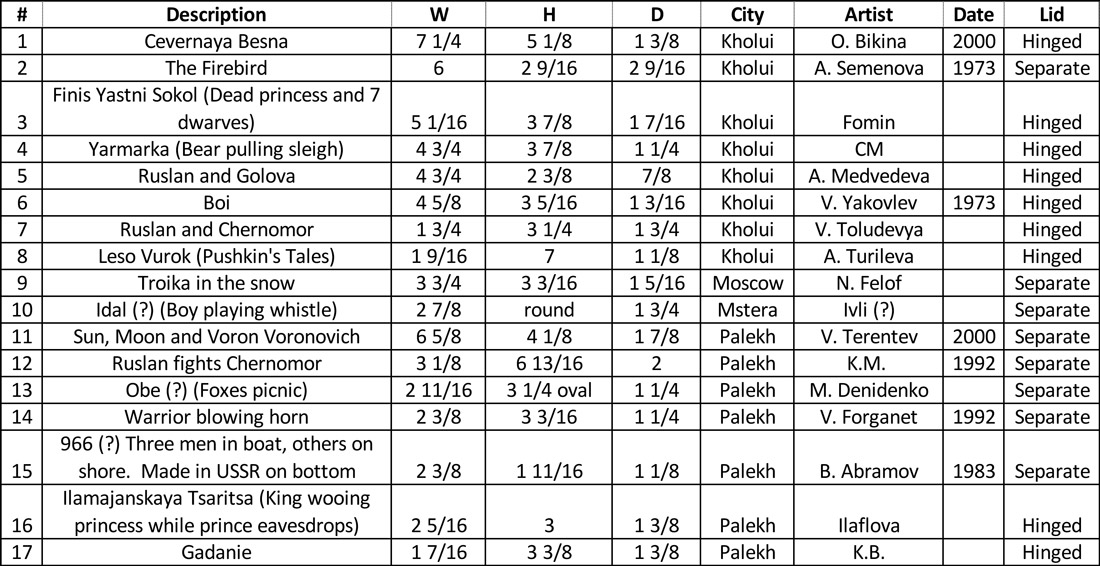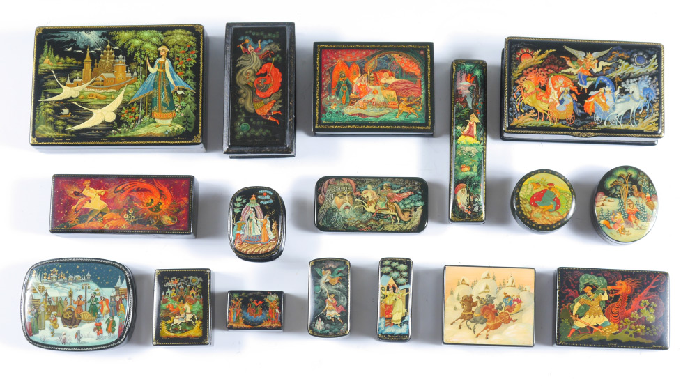 17 RUSSIAN LACQUER BOXES: An assembled collection of 17 boxes, in a variety of sizes and shapes, some signed, largest 1 1/2'' h. x 7'' x 5''. Listing as follows 1) Cevernaya Besna 7 1/4'' x 5 1/8'' x 1 3/8'' Kholui, O. Bikina, 2000, Hinged. 2) The Firebird 6'' x 2 9/16'' x 2 9/16'' Kholui, A. Semenova, 1973, Separate. 3) Finis Yastni Sokol (Dead princess and 7 dwarves) 5 1/16'' x 3 7/8'' x 1 7/16'', Kholui, Fomin, Hinged. 4) Yarmarka (Bear pulling sleigh) 4 3/4'' x 3 7/8'' x 1 1/4'' Kholui, CM, Hinged. 5) Ruslan and Golova 4 3/4'' x 2 3/8'' x 7/8'' Kholui, A. Medvedeva, Hinged. 6) Boi 4 5/8'' x 3 5/16'' x 1 3/16'' Kholui, V. Yakovlev, 1973, Hinged. 7) Ruslan and Chernomor 1 3/4'' x 3 1/4'' x 1 3/4'' Kholui, V. Toludevya, Hinged. 8) Leso Vurok (Pushkin's Tales) 1 9/16'' x 7'' x 1 1/8'' Kholui, A. Turileva, Hinged. 9) Troika in the snow 3 3/4'' x 3 3/16'' x 1 5/16'' Moscow, N. Felof, Separate. 10) Idal (?) (Boy playing whistle) 2 7/8'' dia. x 1 3/4'' Mstera, Ivli (?), Separate. 11) Sun, Moon and Voron Voronovich 6 5/8'' x 4 1/8'' x 1 7/8'' Palekh, V. Terentev, 2000, Separate. 12) Ruslan fights Chernomor 3 1/8'' x 6 13/16'' x 2'' Palekh, K.M., 1992, Separate. 13) Obe (?) (Foxes picnic) 2 11/16'' x 3 1/4'' oval x 1 1/4'' Palekh, M. Denidenko, Separate. 14) Warrior blowing horn 2 3/8'' x 3 3/16'' x 1 1/4'' Palekh, V. Forganet, 1992 ,Separate. 15) 966 (?) Three men in boat, others on shore. Made in USSR on bottom 2 3/8'' x 1 11/16'' x 1 1/8'' Palekh, B. Abramov, 1983, Separate. 16) Ilamajanskaya Tsaritsa (King wooing princess while prince eavesdrops) 2 5/16'' x 3'' x 1 3/8'' Palekh, Ilaflova, Hinged. 17) Gadanie 1 7/16'' x 3 3/8'' x 1 3/8'' Palekh, K.B., Hinged