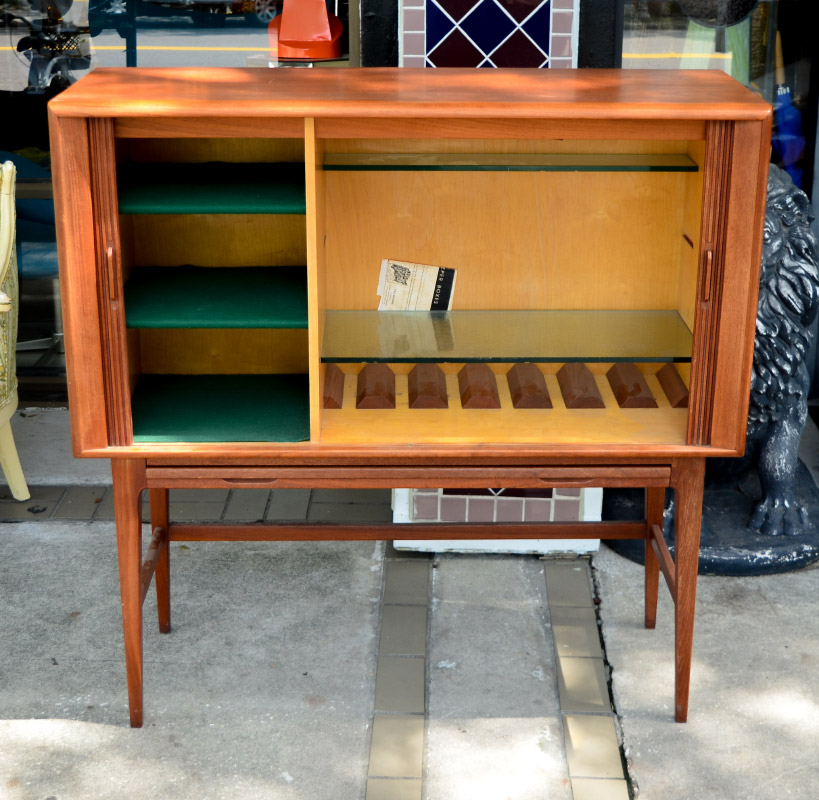 DANISH MID CENTURY TEAK TAMBOUR BAR: Tambour door cabinet, the illuminated interior with 2 glass shelves (originally there where three), bottle racks and shelving. No visible marking or label. Approx. 43'' x 43''x 16''.