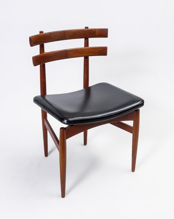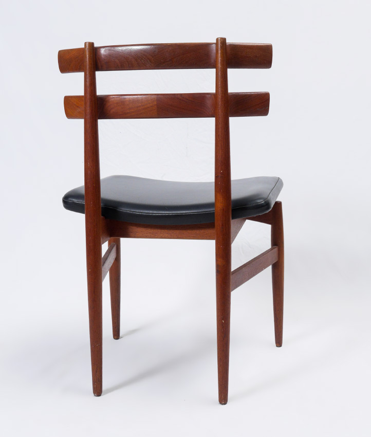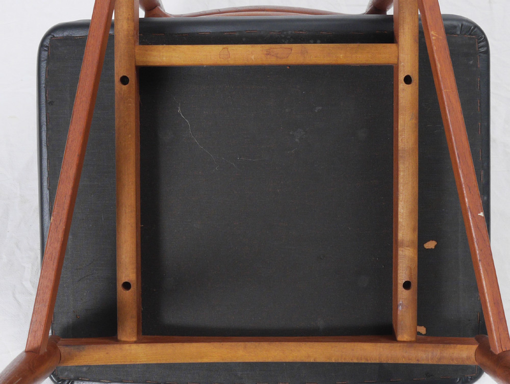 DANISH TEAK MID CENTURY MODERN CHAIR: Back with 2 shaped rails, shaped skirt, tapered legs and supports. Black vinyl seat, no visible makers name or marks. Overall 30 1/2'' h. x 19'' x 18''.