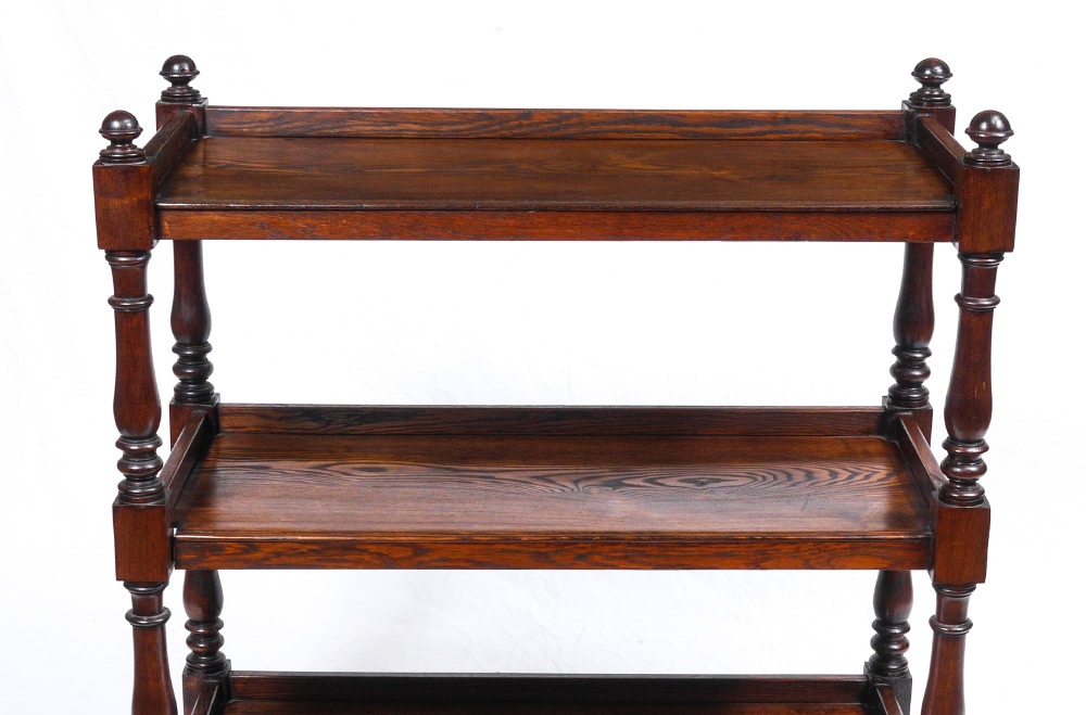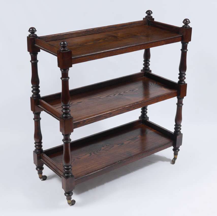 19TH CENTURY OAK DUMB WAITER: 3 tiers with turned supports and finials on castors. 44 1/2'' h. x 41 1/4'' x 17 1/2''.