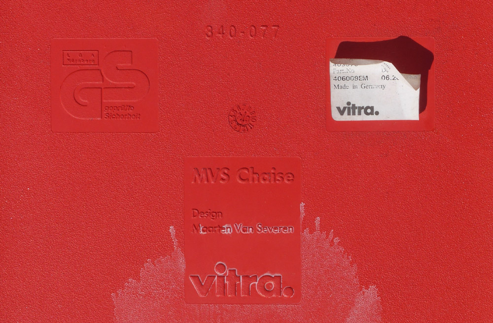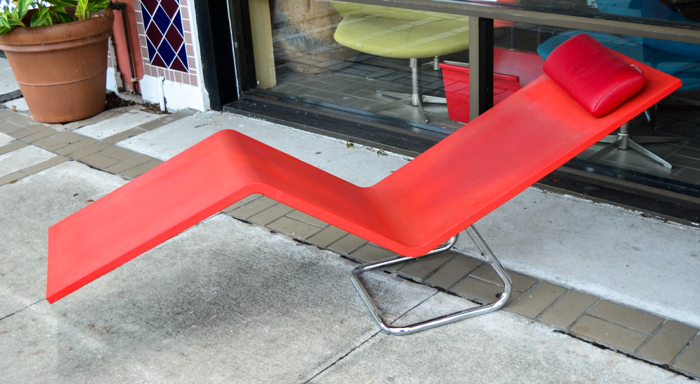 VITRA MVS CHAISE LOUNGE CHAIR: Designed by Maarten Van Severen, polyurethane form shell, chromed stainless steel base, red leather head cushion. 34 1/2'' h. x 16'' x 60 3/4''.