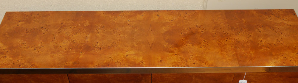 PIERRE CARDIN BURL OLIVE SIDEBOARD: Burl olive veneer with brass accents and trim, left 2 with internal drawers and shelf, right side with shelves. Overall 30 1/4'' h. x 24 1/4'' x 19''.