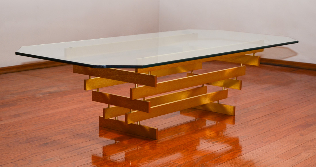 PAUL MAYEN BRASS & GLASS COFFEE TABLE: Base with stacked brass panels, unmarked, 15 1/2'' h. x 40 1/4'' x 20 1/4''. Glass top with canted corners, 60'' x 30''.