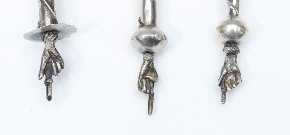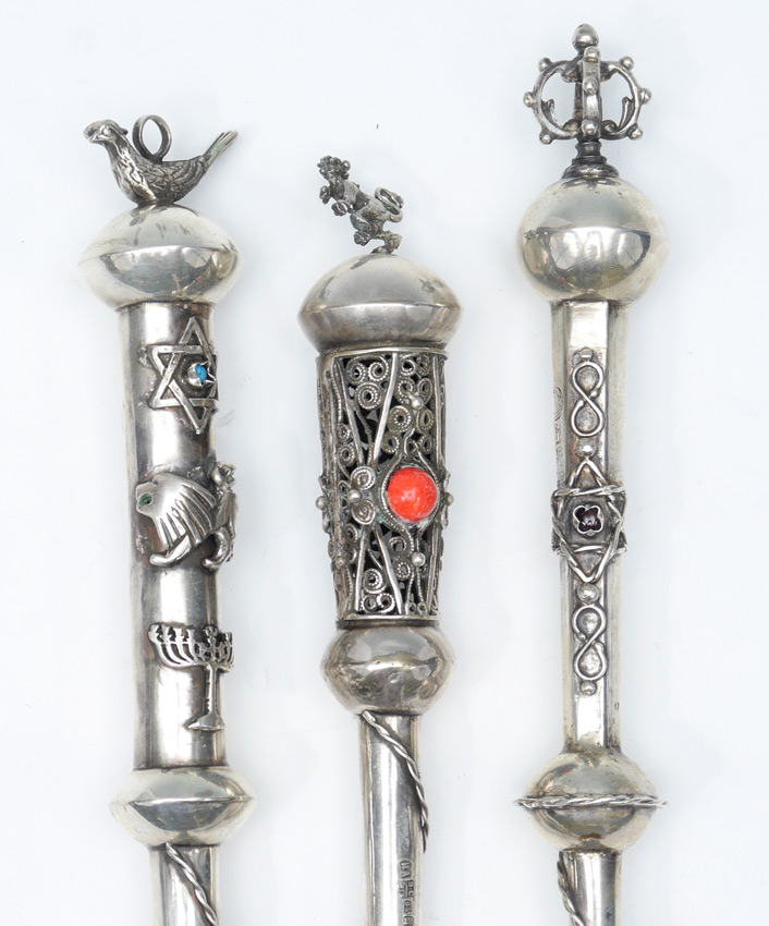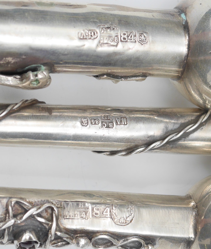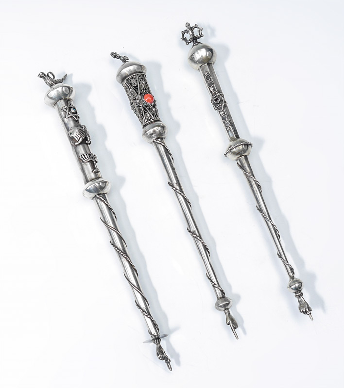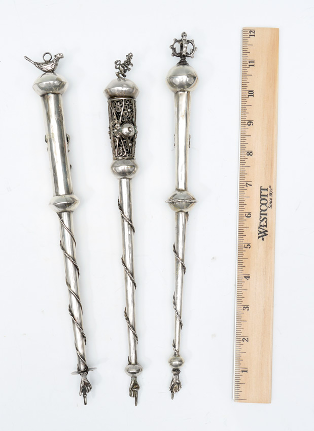 3 RUSSIAN SILVER TORAH POINTERS: 3 pieces total with spurious Russian hallmarks, assorted designs with inset cabochon stones. Longest 12'', approx. 4.2 troy oz inclusive.