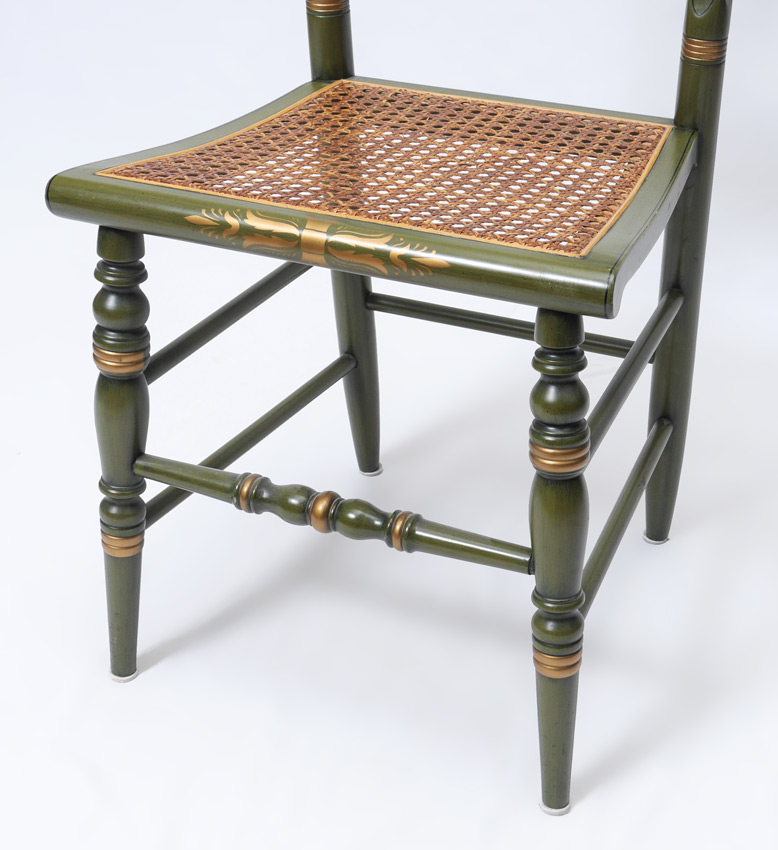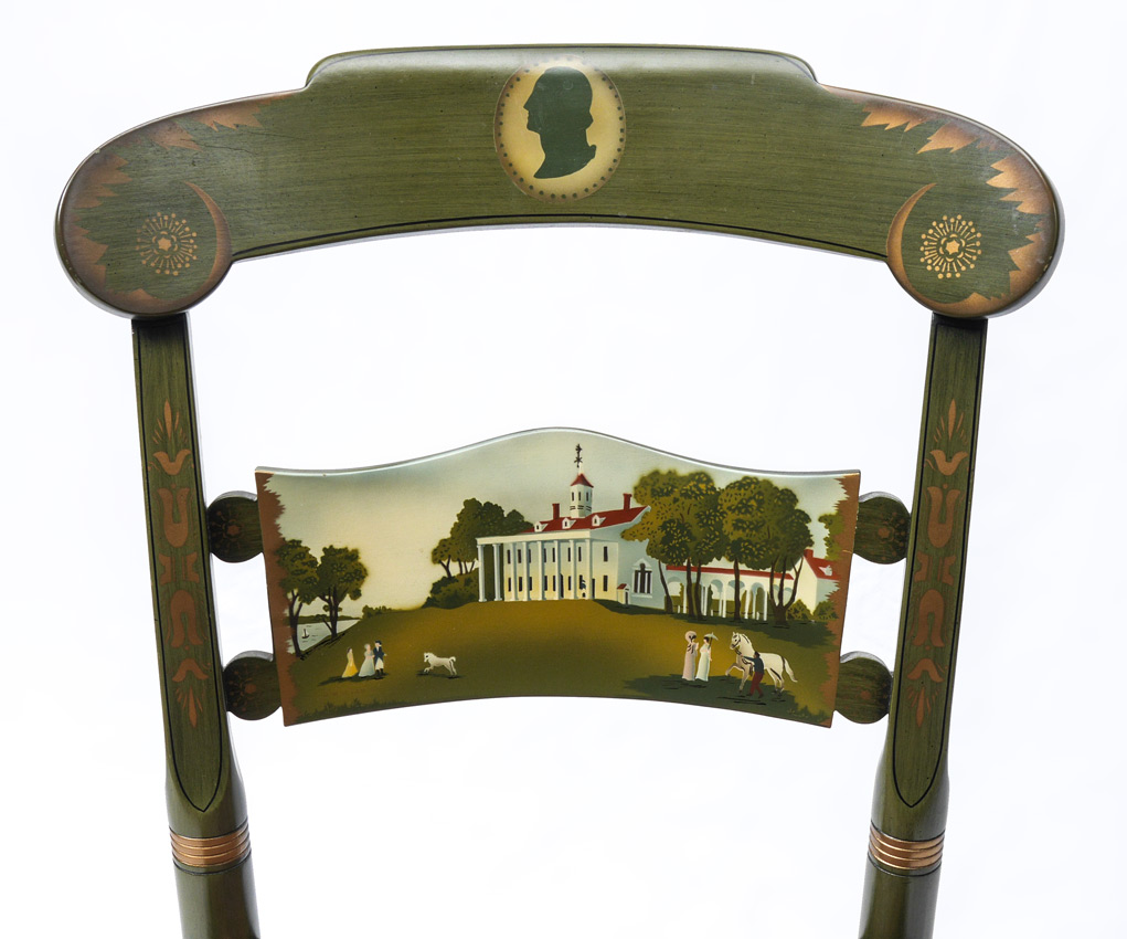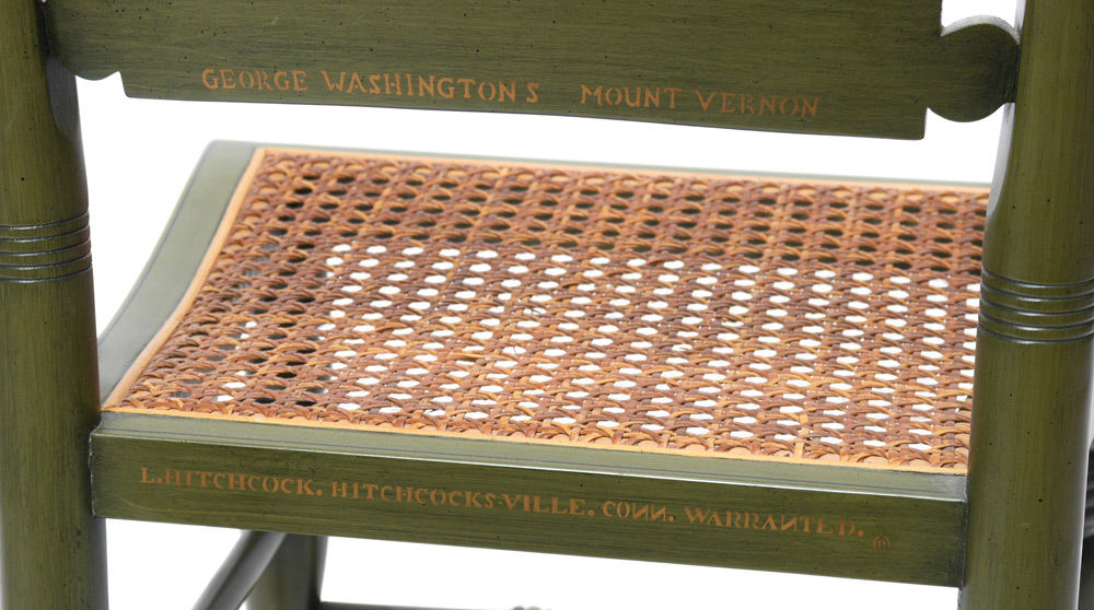 GEORGE WASHINGTON HITCHCOCK SIDE CHAIR: Green painted all over, top rail with silhouette of Washington, lower splat with paint decorated scene of Mt. Vernon. Turned legs and stretchers, woven seat. Marked on back with ''George Washington's Mount Vernon'' and ''L. Hitchcock. Hitchcocks-ville. Conn. Warranted.'' 35 1/2'' h. x 17 1/2'' x 19''.