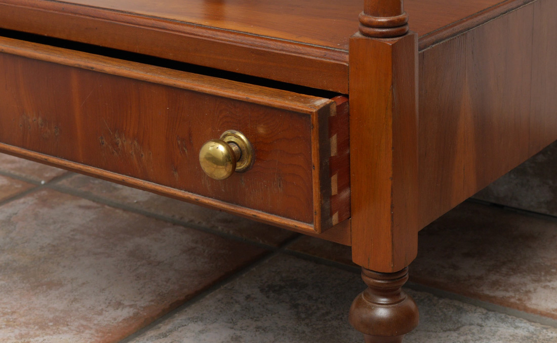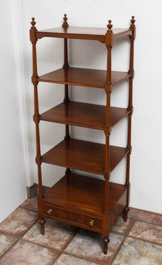 5 SHELF WHATNOT STAND: Turned finials, 5 shelves with lowest shelf over single drawer, turned feet. Overall 54'' h. x 18 3/4'' x 15 3/4''