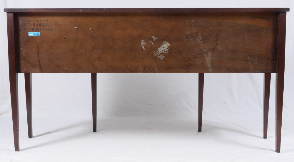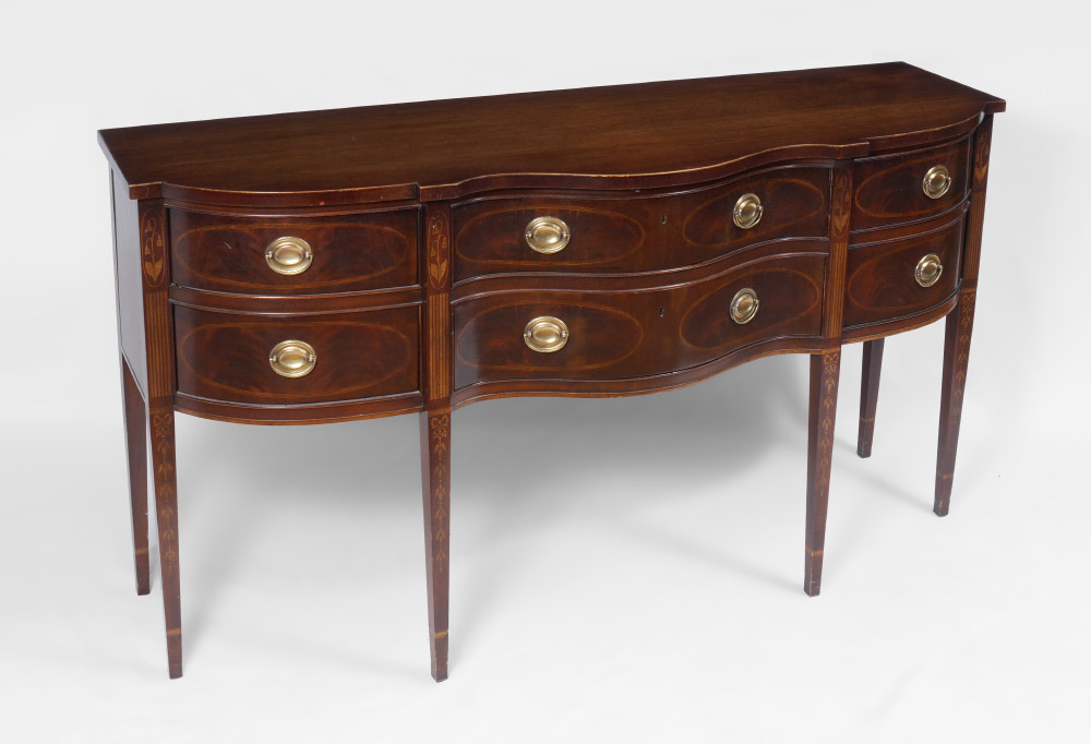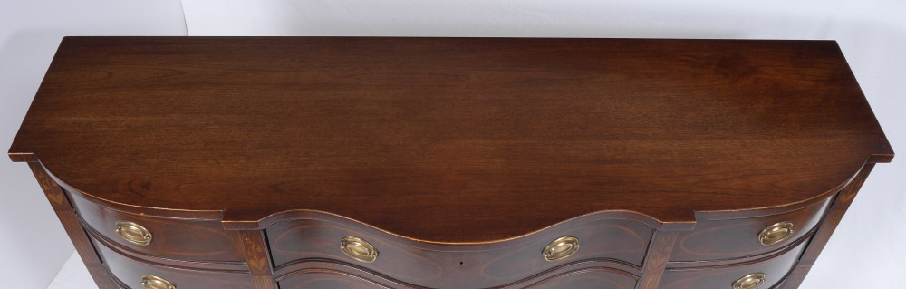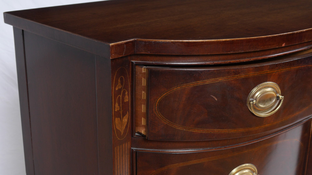 DREXEL HERITAGE HEIRLOOMS MAHOGANY SIDEBOARD: Serpentine top, 3 drawer over 3 drawers with string inlay decoration. Top central drawer fitted with felt lined silverware holder. Floral motif marquetry inlaid legs. 38 1/4'' h. x 72'' x 24''.