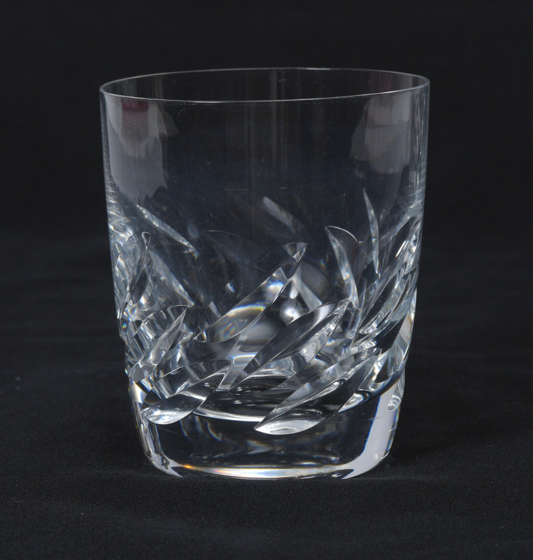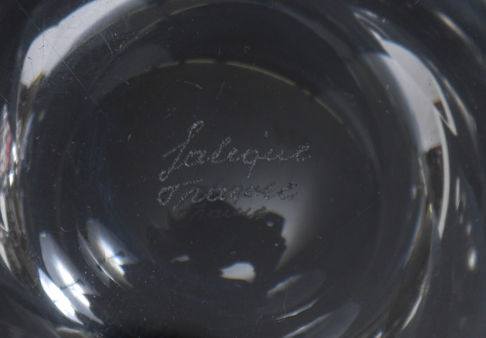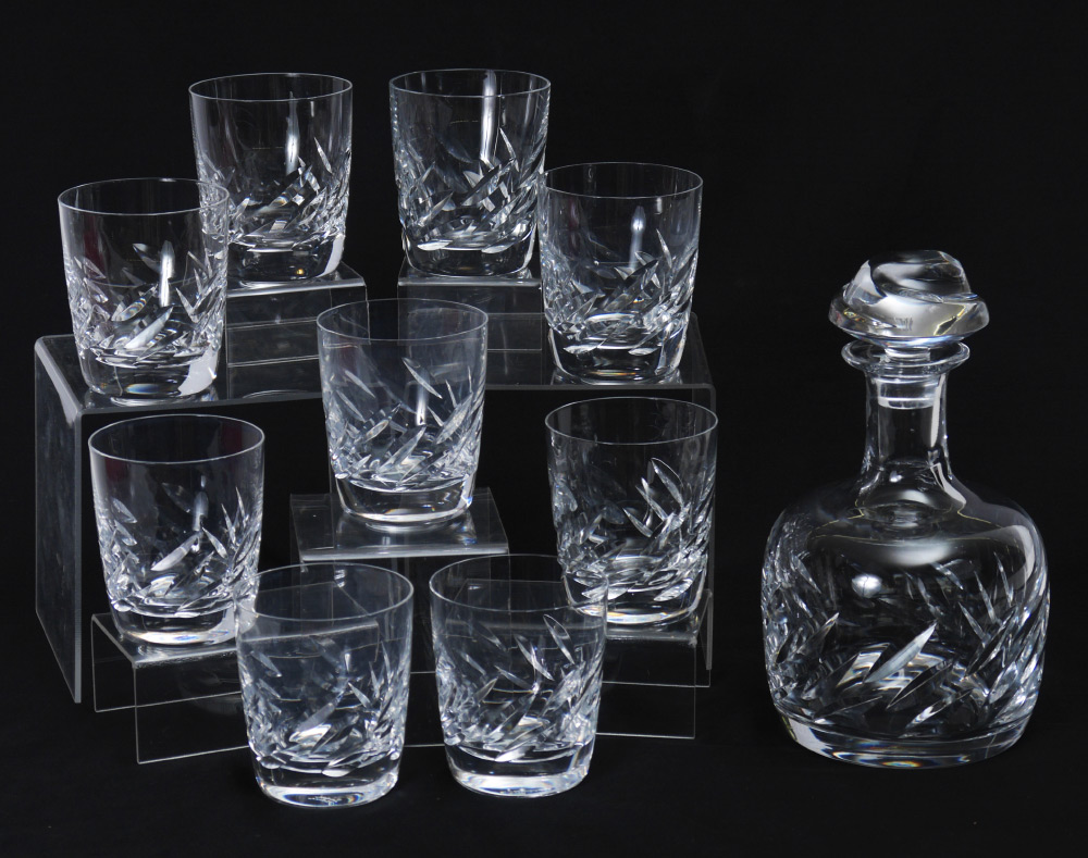 LALIQUE ARTOIS CRYSTAL DECANTER AND 9 TUMBLERS: 10 pieces total in the Artois pattern to include the decanter with stopper (9 /2'' h.), 9 tumblers 3 3/4'' h.