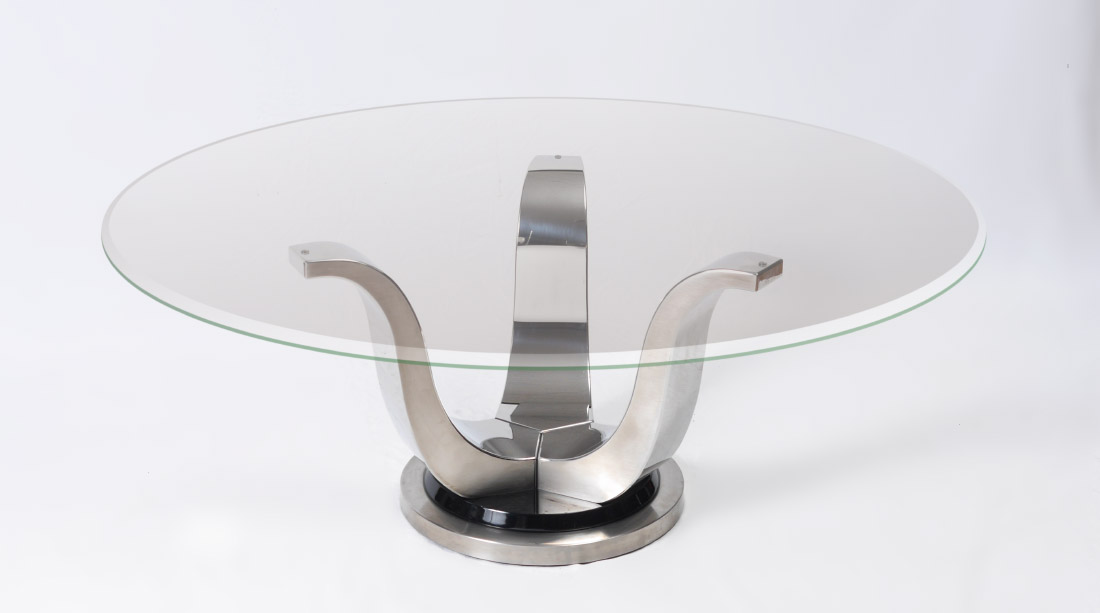 SCAN DESIGN ROUND GLASS TOP COFFEE TABLE: Stainless steel and chrome base with flared supports, 18'' h. x 25 1/2''. Beveled glass round top 48'' dia.