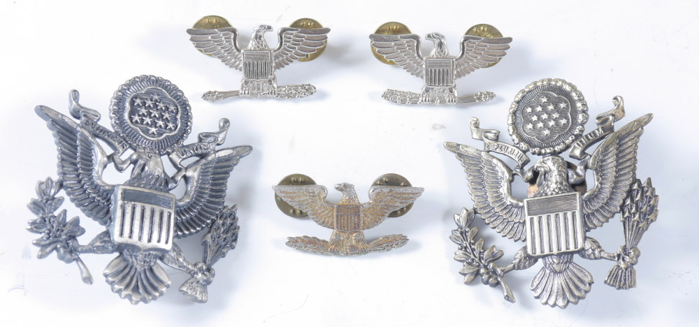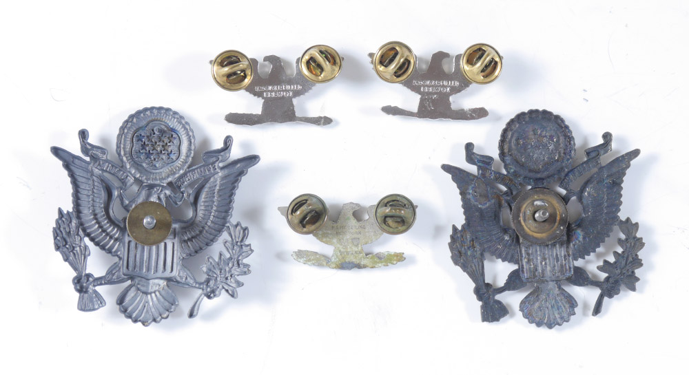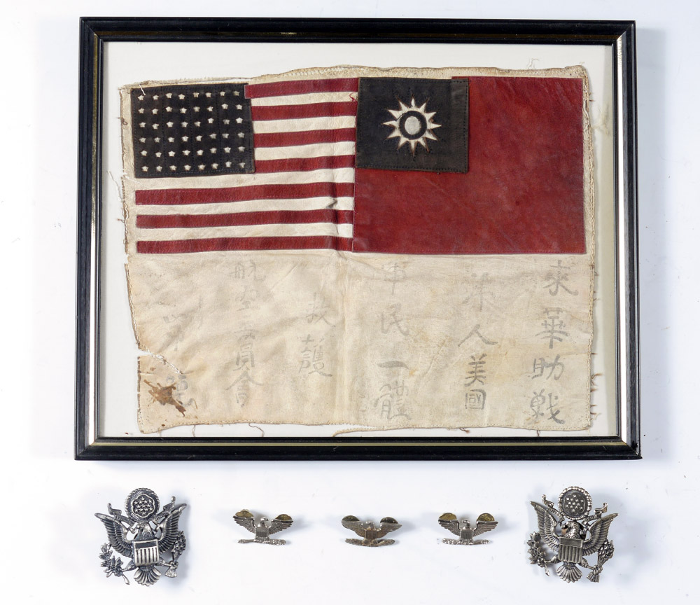WWII LEATHER BLOOD CHIT AND HAT BADGES: Theater made leather blood chit and accompanying hat badges from Col. Henry Hoffs, USAF, who served in WWII, Korea, and Vietnam. Chit measures 9'' x 11 3/4'', framed, 11 1/4'' x 14 1/4''.