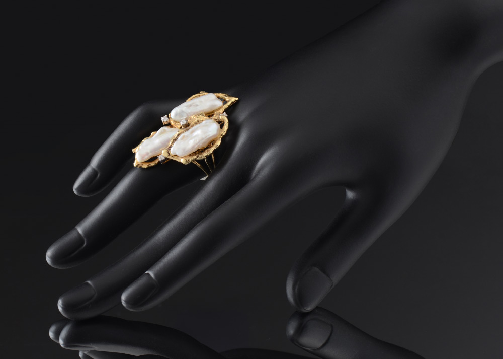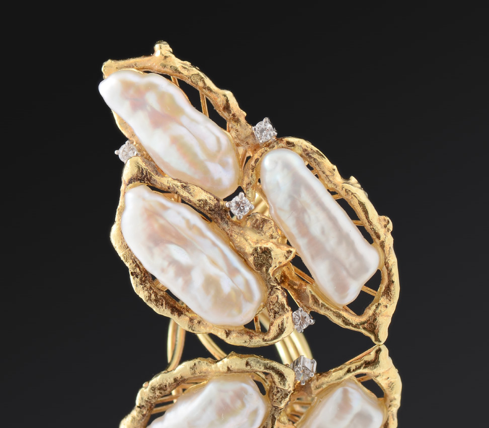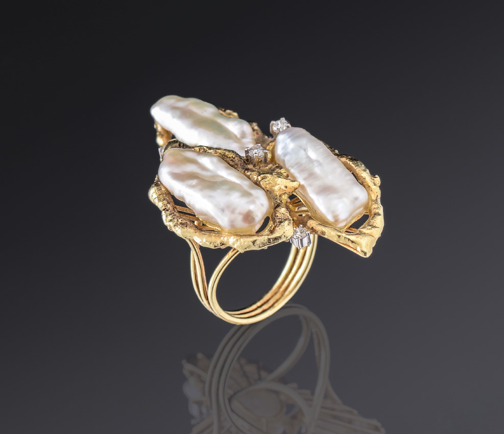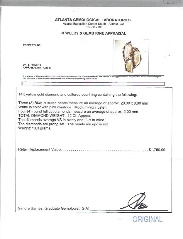 BIWA PEARL AND DIAMOND RING: 14K yellow gold ring with 3 Biwa cultured pearls, 20 x 8 mm., white with pink overtones. The accent diamonds total .12 Ct, averaging VS clarity and G-H color. Size 6.5. Weight 13.3 grams. Sold with current Atlanta Gemological GIA graduate's appraisal for $1,750.