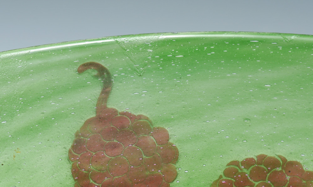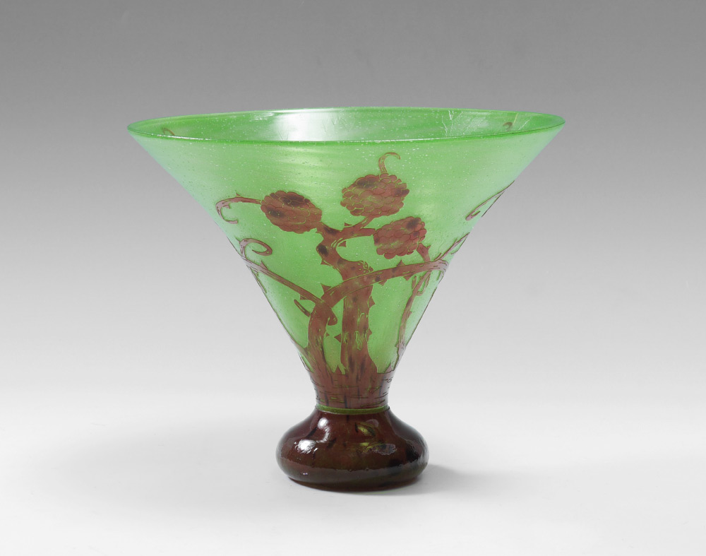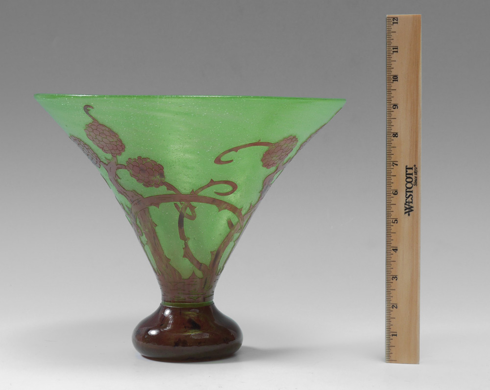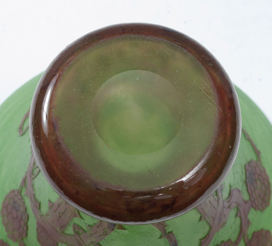 FRENCH BLACKBERRY CAMEO GLASS VASE: Flared green glass body with brown cameo cut thorny blackberries, no visible signature or mark. Overall measures 9'' h. x 11'' dia.