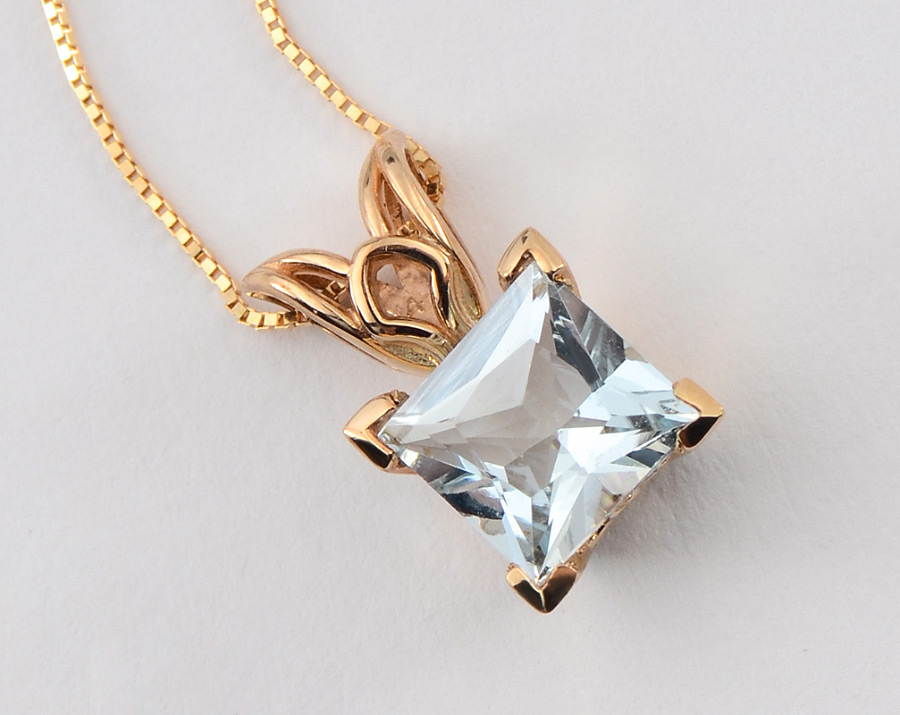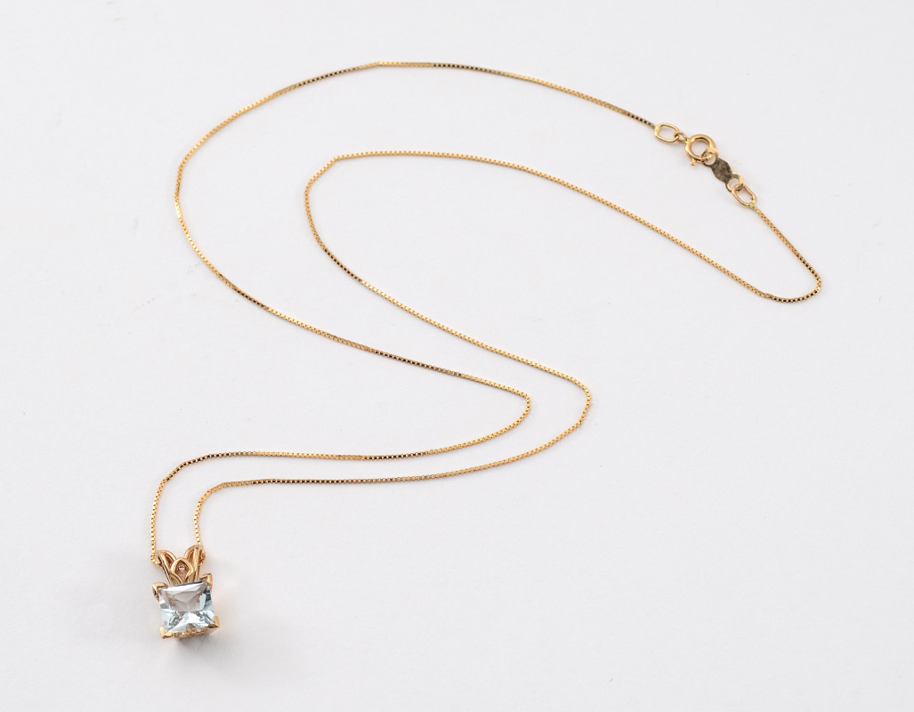 AQUAMARINE PENDANT & CHAIN: 14K yellow gold pendant contains one square cut aquamarine, approx. 1.50 Ct. Prong set. The 18'' yellow gold chain is 14K. Weight: 2.0 grams.