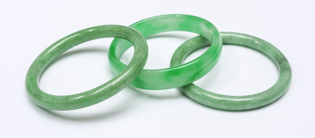 3 JADE / JADEITE BRACELETS: 3 total, carved jade or jadeite, all three 2'' interior dia.