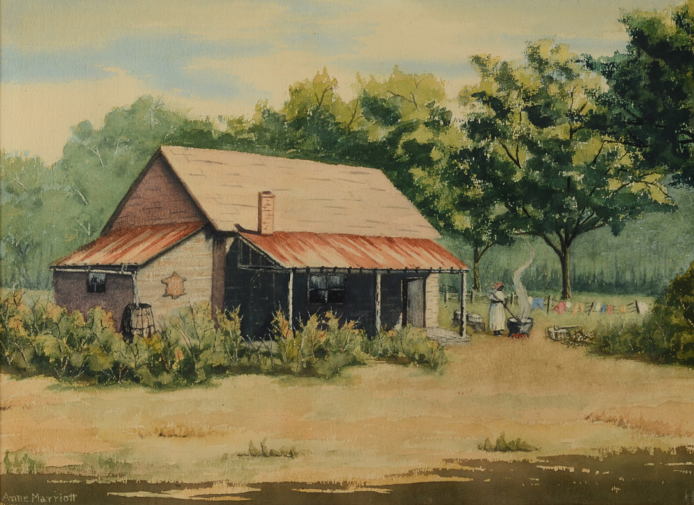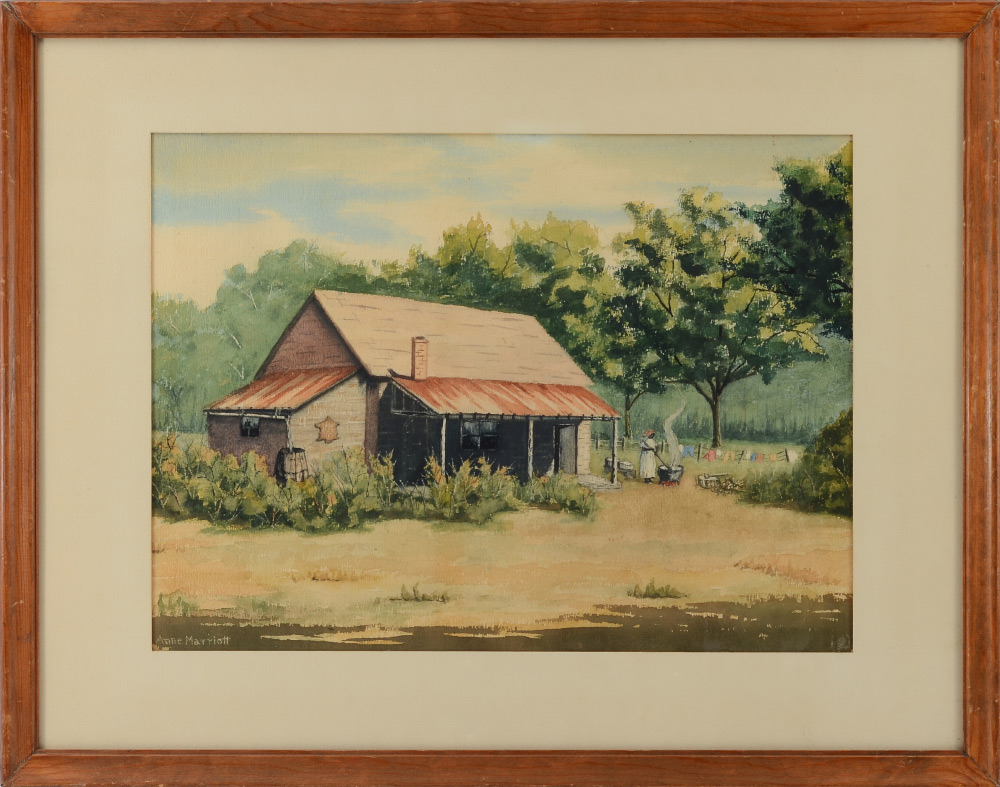 ANNE MARRIOT SOUTHERN SHACK PAINTING: Scene Depicts an African American Washing Clothes in a Cauldron in a Country Landscape, Watercolor, sight size 14'' x 19'', signed lower left, framed, 21 1/2'' x 27 1/2''.