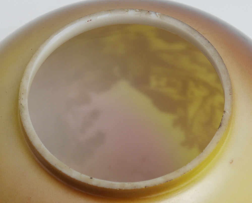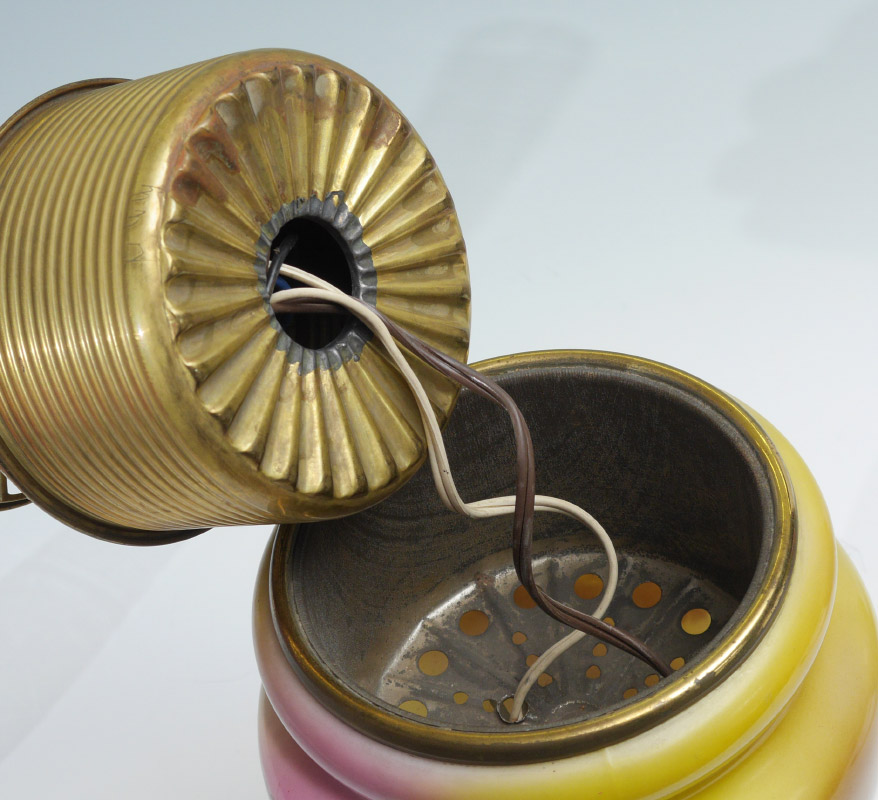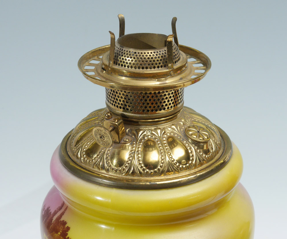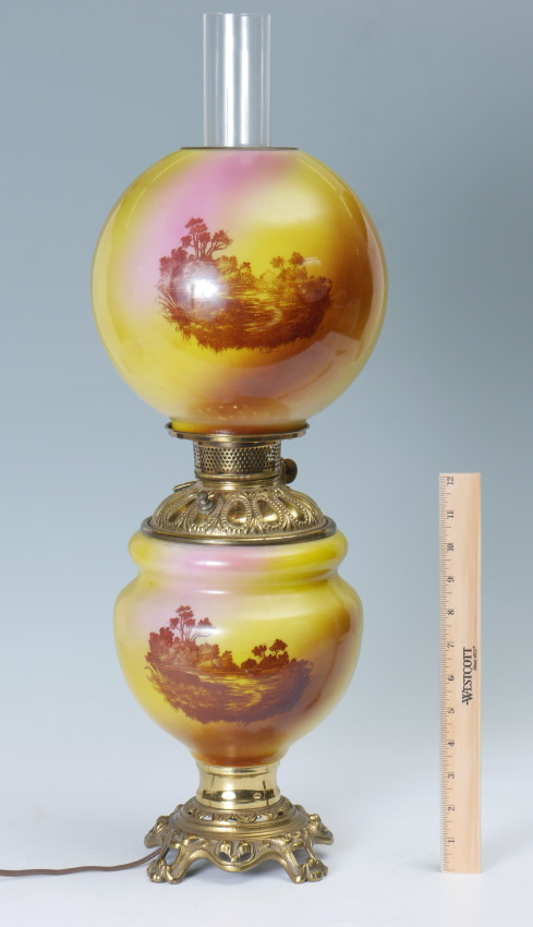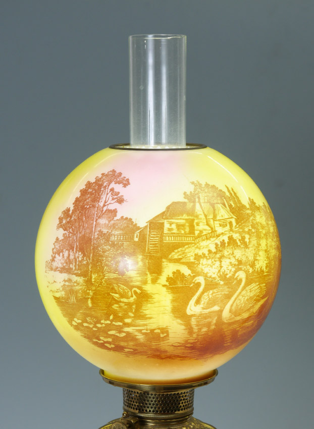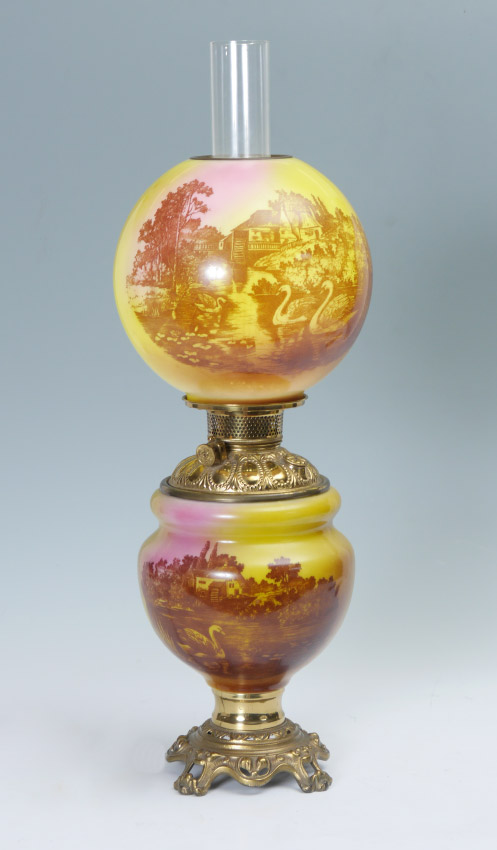 GONE WITH THE WIND PARLOR LAMP: Base and shade with mottled pink and yellow glass with transfer decoration of swans in pond landscape with mill. Base with brass font, gilt metal foot, electrified, 14 3/4'' h. x 7''. Shade 8 1/2'' with 4'' fitter rim, clear chimney 12'' h.