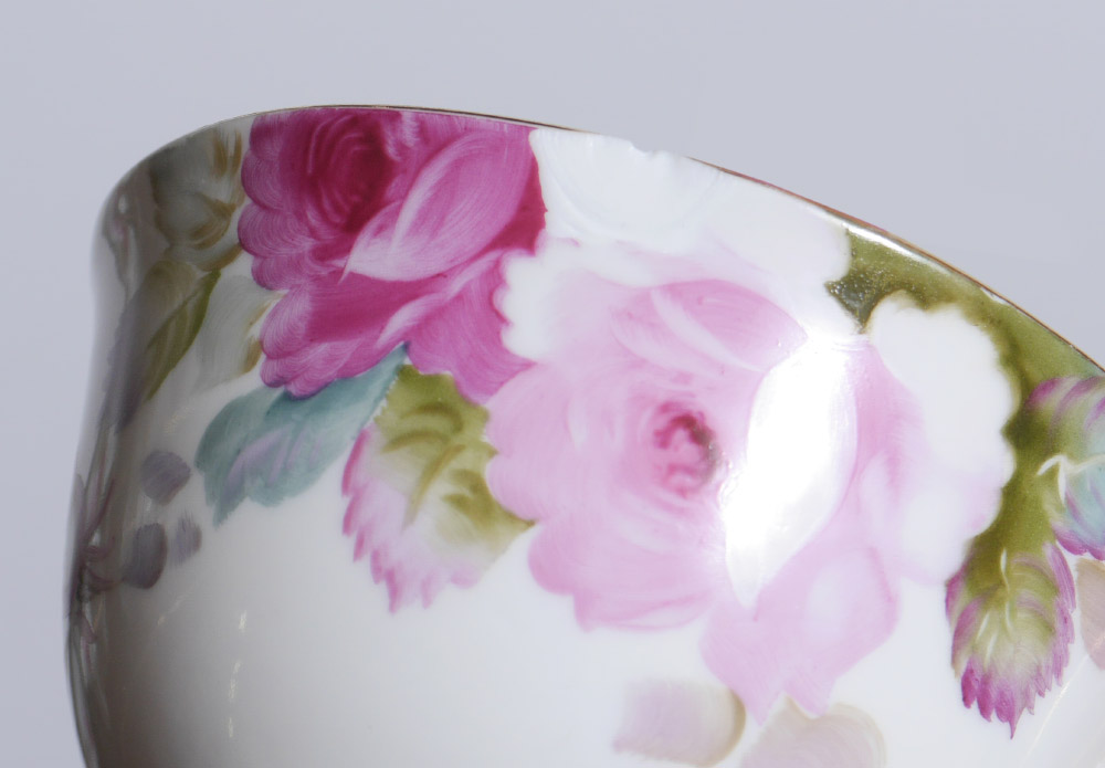 HAND PAINTED NORITAKE PINK ROSE CHINA: Approx. 92 pieces in the ''Pink Rose'' pattern by Noritake to include 12 dinner plates (10''), 12 salad plates (7 1/2''), 12 bread plates (6 1/2''), 12 dessert bowls (5 1/2''), 12 soup bowls (7 1/2''), 12 cups (1 with chip), 12 saucers, creamer, covered sugar, coffee pot, 12'' platter, 16'' platter, open vegetable bowl (has chip), covered vegetable, and the gravy boat. Made in Japan.