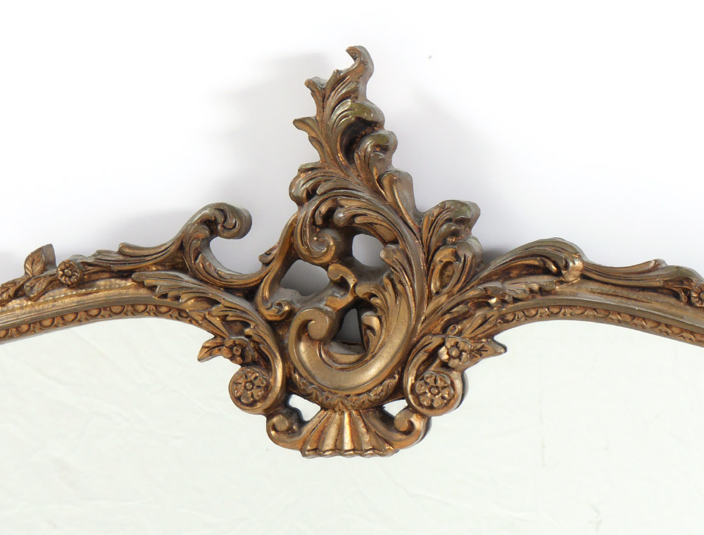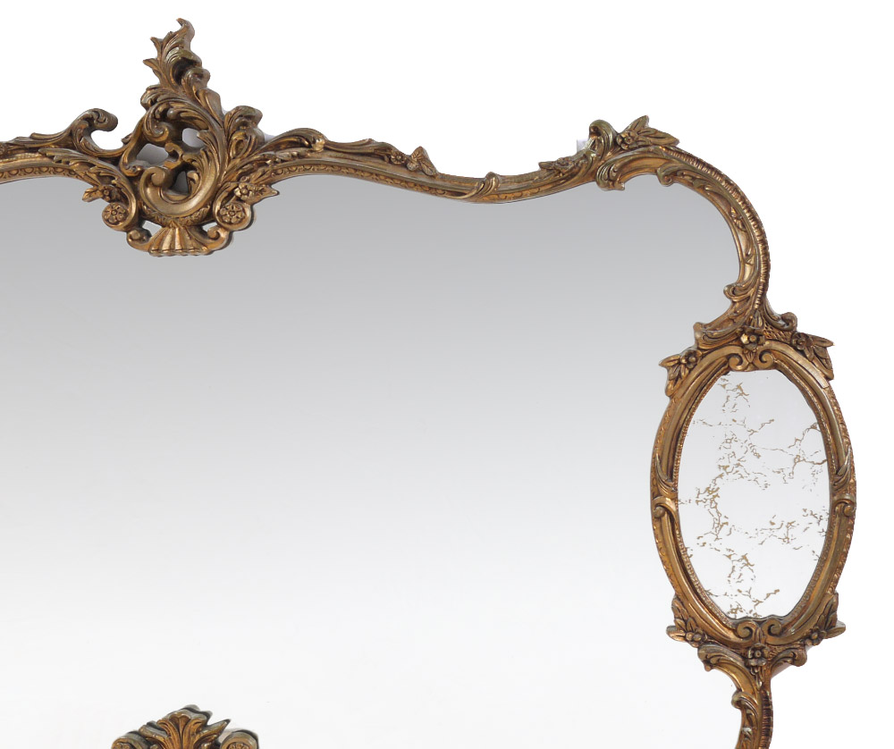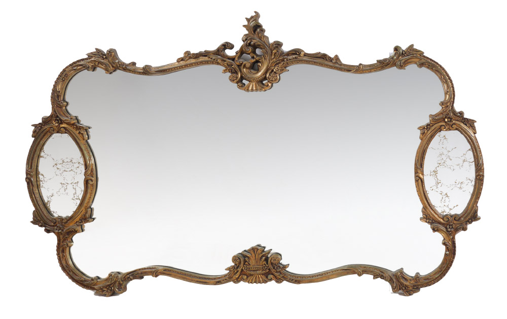 LARGE ROCOCO CARVED GILT WOOD WALL MIRROR: Rococo style with openwork foliate scroll center crest, carved and shaped frame, shaped center mirror, 2 oval side mirror with gold veining. Overall measures 48 1/2'' h. x 72 1/2'' x 2''.