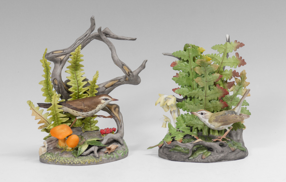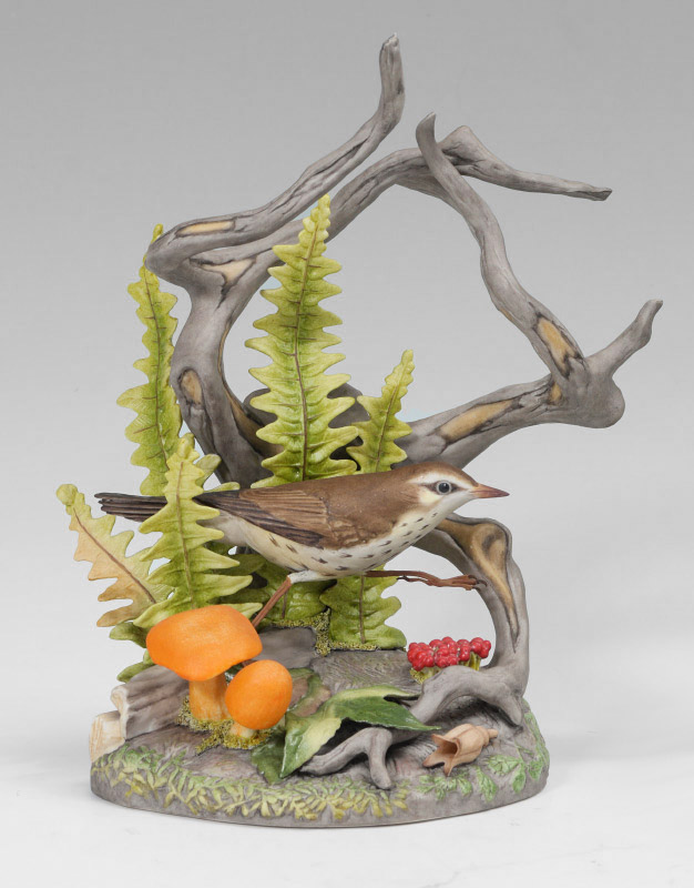 2 PIECE BOEHM NORTHERN WATER THRUSH 490 PORCELAIN BIRD SCULPTURE: Measures approx. 10 1/2'' x 9'' x 7''. Sold together with the Boehm Oven Bird 400-4, 9'' x 8'' x 7''.
