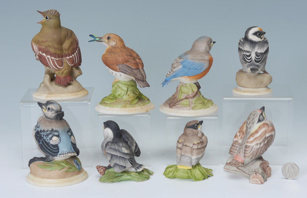 8 PIECE BOEHM PORCELAIN BABY BIRD SCULPTURES: Baby Blue Bird 442, Baby Wood Thrush 444, Baby Blue Jay 436, Baby crested Flycatcher 458, Baby Cedar Waxwing 432, Baby Chickadee 461, Tufted Red Poll 495, Baby Robin 436, and Fledgling Blackhurnian Warbler 478. Measures 3''-5 1/2'' tall.