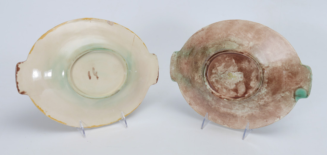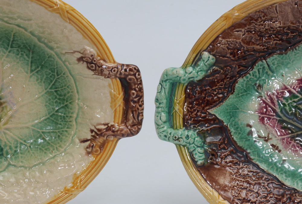 13 MAJOLICA PLATES: All with polychrome leaf decoration to include 10 (8 1/4'' dia.), 1 (9 1/4''), 2 platters (2'' x 12 1/4'' x 9'').