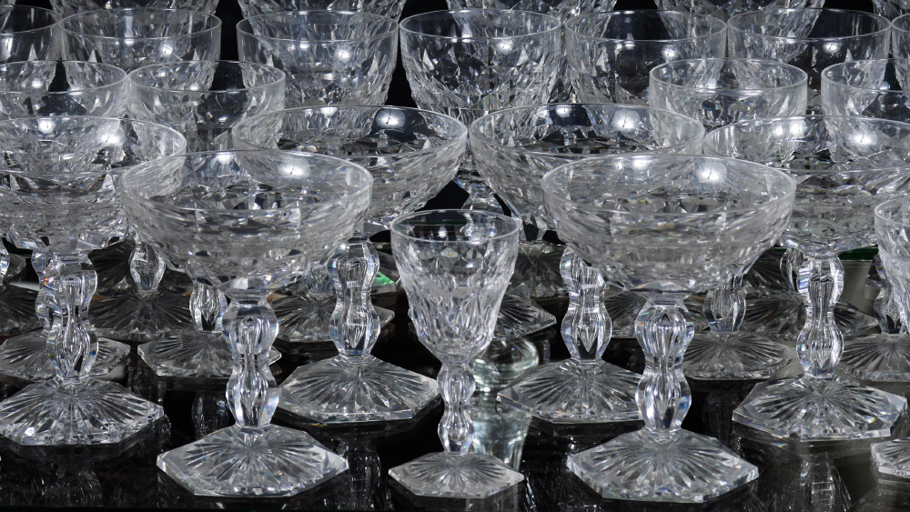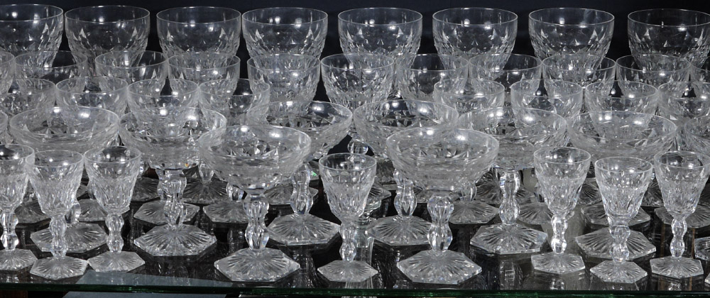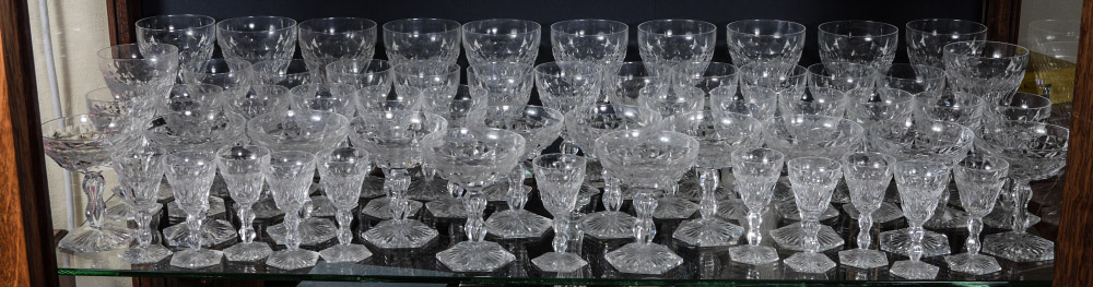 VAL ST LAMBERT LALAING FANTAISIE CRYSTAL STEMWARE: Approx. 58 pieces in the Lalaing Fantaisie pattern by Val St Lambert to include 10 iced tea (6 7/8''), 2 water (6 1/4''), 11 wine (5 1/2''), 12 wine (5 1/4''), 12 champagne / sherbet (4 3/4''), 11 cordial (4 1/8'').