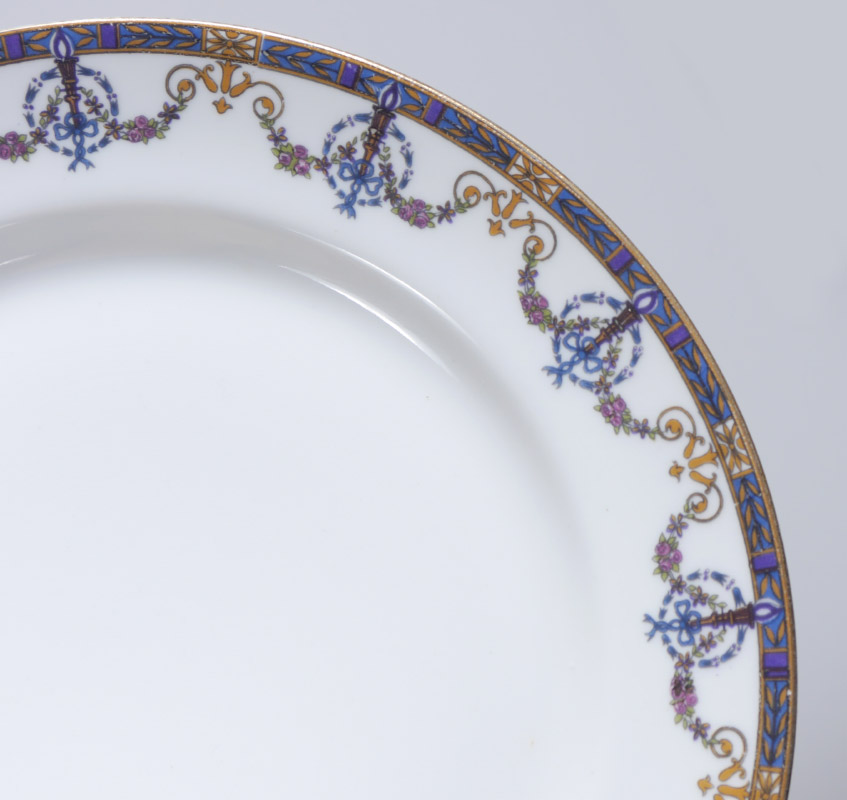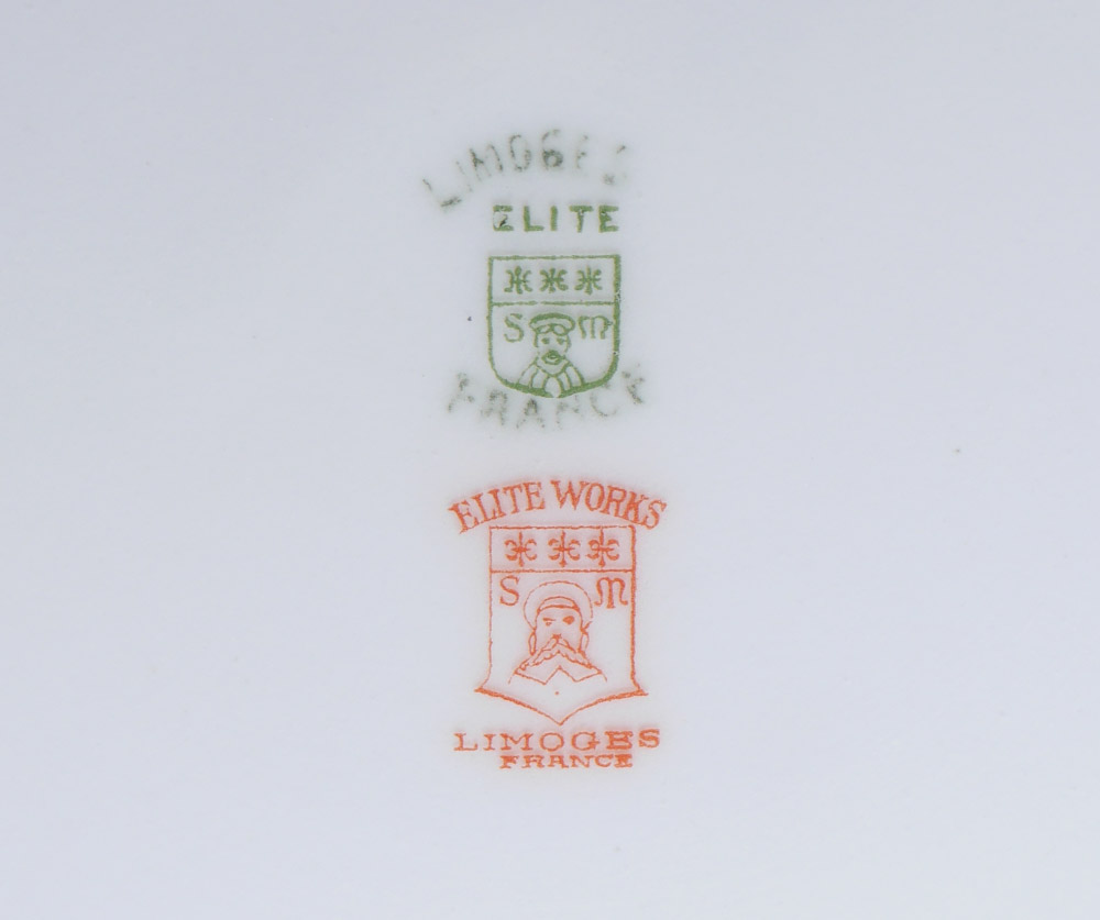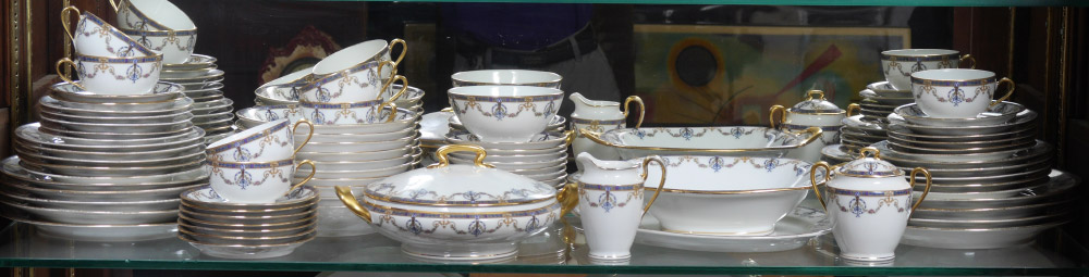 BAWO & DOTTER ELITE WORKS FRENCH LIMOGES CHINA: Early 1900's. Approx 74 pieces to include 9 dinner plates (10''), 10 salad plates, 10 bread plates, 10 soup bowls, 12 dessert bowls, 7 cups, 10 saucers, a square open vegetable bowl, covered vegetable bowl, creamer, sugar, and an 11.5'' platter.