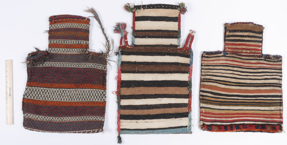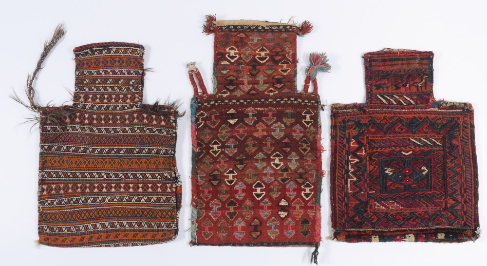 THREE APPROX. 60-75 YR. OLD PERSIAN HANDMADE WOOL SALT BAGS, each 1'10'' x 1'2'': These charming bags have been made using a variety of techniques to create colorful designs on objects that were originally strictly a utilitarian item. The first bag has a zig-zag design around diamonds in a square done in colors of reds, blues, and white. There are birds on the funnel part of the bag and the back of the bag has a striped pattern. The second bag has small repeating push me-pull you arrows motif in many colors on a red field. Also with a striped back. The last bag has a pattern of various colored bands with small geometric motifs. The back has a diamond lattice design between white bands. These bags would make a one of a kind art installation on a wall in your home. The cocktail lounge of the Watergate building used to have a collection of bags that was the artwork for the room.